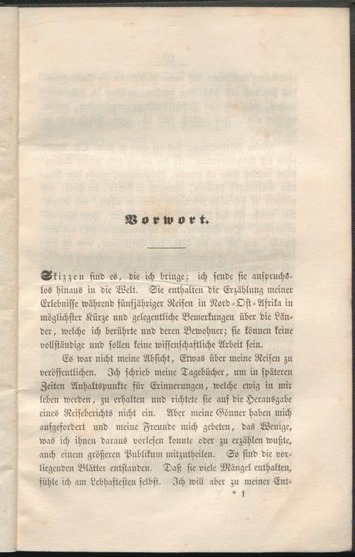 Skizzen sind es, die ich bringe; ich sende sie anspruchslos hinaus in die Welt. Sie enthalten die Erzählung meiner Erlebnisse während fünfjähriger Reisen in Nord-Ost-Afrika in möglichster Kürze und gelegentliche Bemerkungen über die Länder, welche ich berührte und deren Bewohner; sie können keine vollständige und sollen keine wissenschaftliche Arbeit sein.