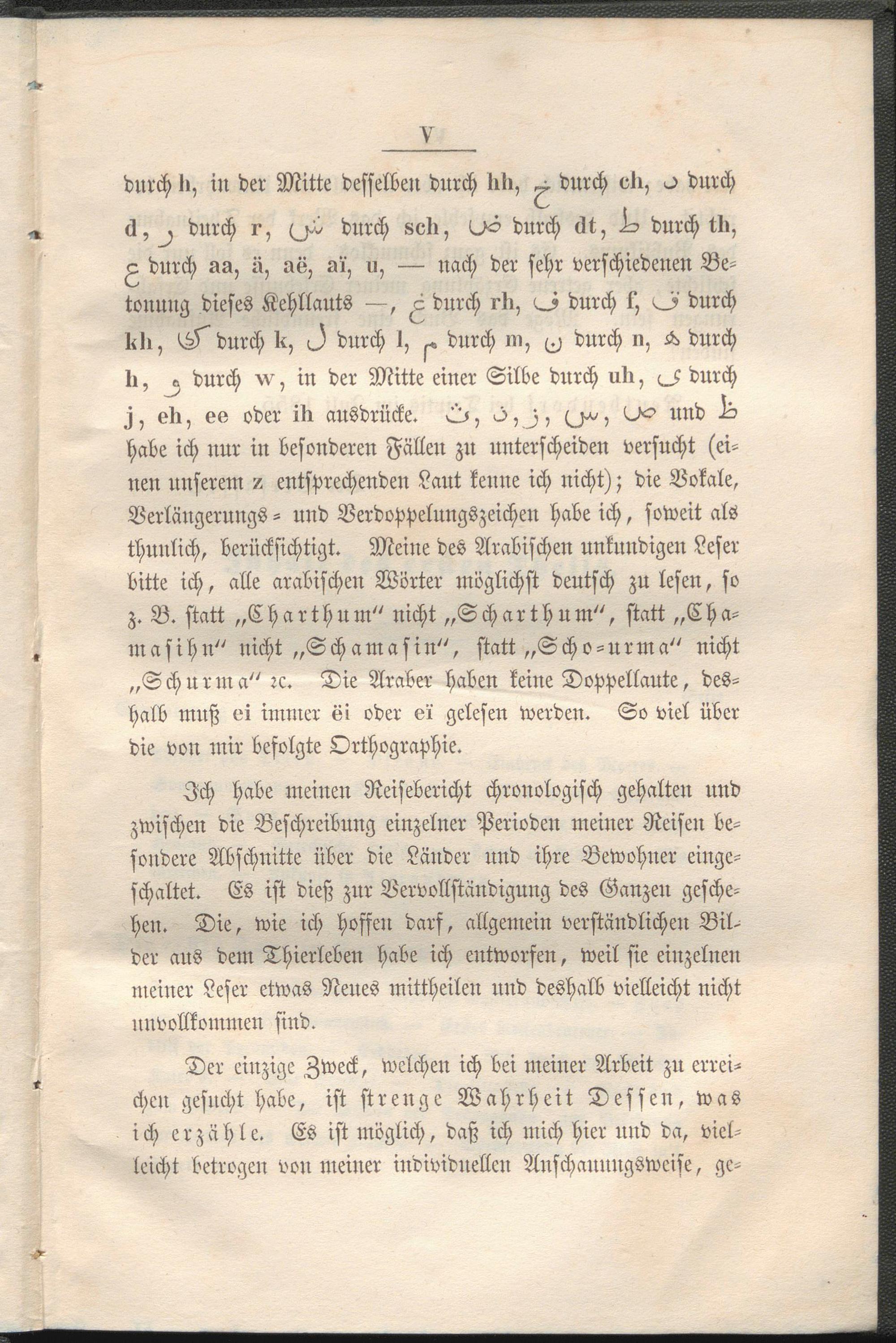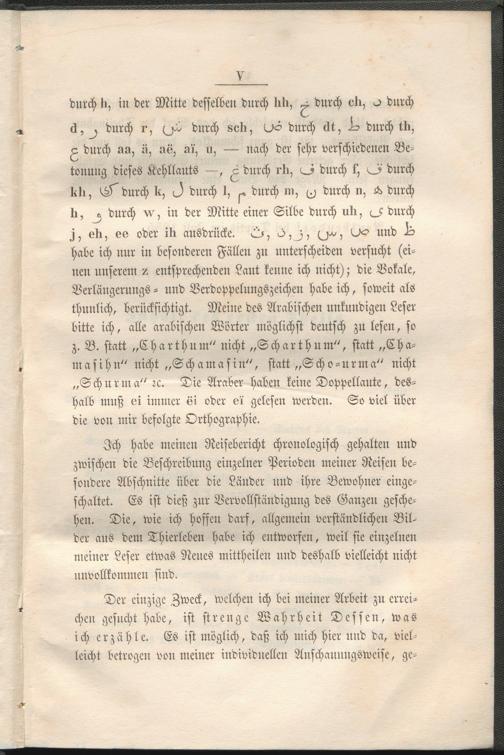 durch 1», in der Mitte desselben durch trli, durch elr, durch 6,^ durch r, ^ durch 8oll, durch 6t, ^ durch tli, ^ durch au, 3, 3ö, 3i, u, — nach der sehr verschiedenen Betonung dieses Kehllauts —, ^ durch i !>, durch 5, ^ durch Iil>, ^ durch Ir, ^ durch l, durch m, durch n, L durch Ii, -> durch >v, in der Mitte einer Silbe durch uli, ^ durch j, elr, ee oder ili ausdrücke, o, o,I, o--, ^ und ^ habe ich nur in besonderen Fallen zu unterscheiden versucht (einen unserem / entsprechenden Laut kenne ich nicht); die Vokale, Verlängerungs - und Verdoppelungszeichen habe ich, soweit als thuulich, berücksichtigt. Meine des Arabischen unkundigen Leser Litte ich, alle arabischen Wörter möglichst deutsch zu lesen, so z. B. statt „Charthum" nicht „Scharthum", statt „Cha- masihn" nicht „Schamasin", statt „Scho-urma" nicht „S ch u r m a" rc. Die Araber haben keine Doppellaute, deshalb muß ei immer ei oder ei gelesen werden. So viel über die von mir befolgte Orthographie.