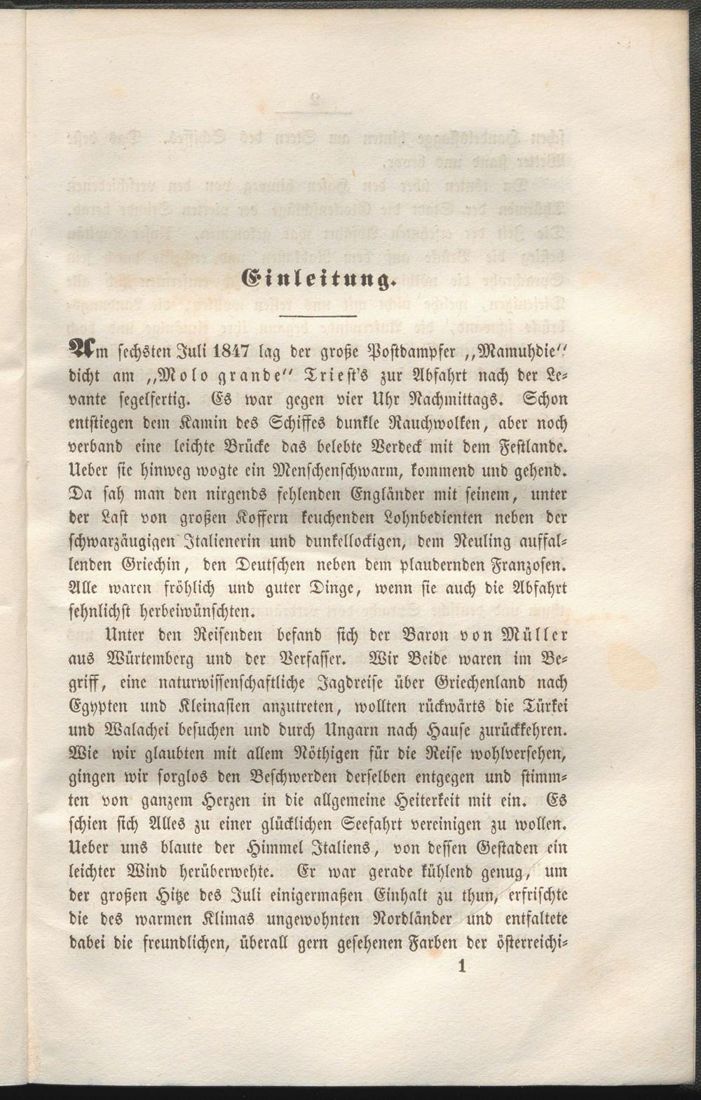 Unter den Reisenden befand sich der Baron von Müller aus Würtcmbcrg und der Verfasser. Wir Beide waren im Begriff, eine naturwissenschaftliche Jagdreise über Griechenland nach Egyptcn und Kleinasien anzutreten, wollten rückwärts die Türkei und Walachei besuchen und durch Ungarn nach Hause zurückkehren. Wie wir glaubten mit allem Nöthigen für die Reise wohlversehcn, gingen wir sorglos den Beschwerden derselben entgegen und stimmten von ganzem Herzen in die allgemeine Heiterkeit mit ein. ES schien sich Alles zu einer glücklichen Seefahrt vereinigen zu wollen. Ueber uns blaute der Himmel Italiens, von dessen Gestaden ein leichter Wind herüberwehte. Er war gerade kühlend genug, um der großen Hitze des Juli einigermaßen Einhalt zu thun, erfrischte die des warmen Klimas ungewohnten Nordländer und entfaltete dabei die freundlichen, überall gern gesehenen Farben der österreichi-