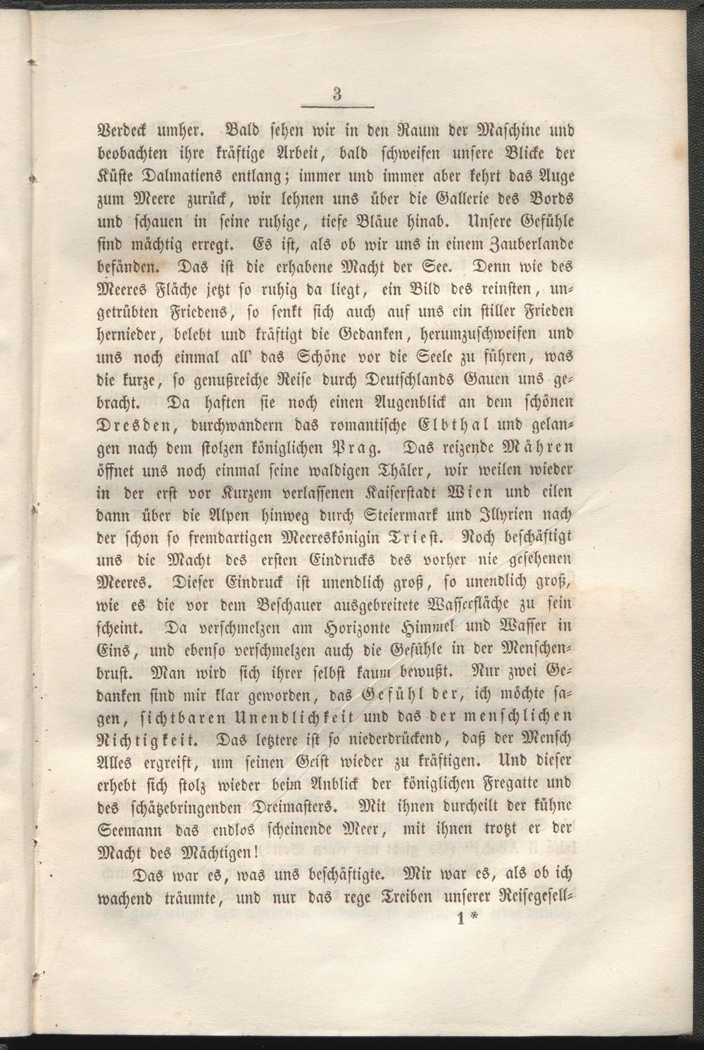 Verdeck umher. Bald sehen wir in den Raum der Maschine und beobachten ihre kräftige Arbeit, bald schweifen unsere Blicke der Küste Dalmatiens entlang; immer und immer aber kehrt das Auge zum Meere zurück, wir lehnen uns über die Galleric des Bords und schauen in seine ruhige, tiefe Bläue hinab. Unsere Gefühle sind mächtig erregt. Es ist, als ob wir uns in einem Zauberlandc befänden. Das ist die erhabene Macht der See. Denn wie des Meeres Fläche jetzt so ruhig da liegt, ein Bild des reinsten, ungetrübten Friedens, so senkt sich auch auf uns ein stiller Frieden hernieder, belebt und kräftigt die Gedanken, herumzuschweifcn und uns noch einmal all' das Schöne vor die Seele zu führen, was die kurze, so genußreiche Reise durch Deutschlands Gauen uns gebracht. Da hasten sie noch einen Augenblick an dem schönen Dresden, durchwandern das romantische Elbthal und gelangen nach dem stolzen königlichen Prag. Das reizende Mähren öffnet uns noch einmal seine waldigen Thäler, wir weilen wieder in der erst vor Kurzem verlassenen Kaiscrstadt Wien und eilen dann über die Alpen hinweg durch Steiermark und Jllyrien nach der schon so fremdartigen Mecreskönigin Trieft. Noch beschäftigt uns die Macht deS ersten Eindrucks des vorher nie gesehenen Meeres. Dieser Eindruck ist unendlich groß, so unendlich groß, wie es die vor dem Beschauer ausgebreitete Wasserfläche zu sein scheint. Da verschmelzen am Horizonte Himmel und Wasser in Eins, und ebenso verschmelzen auch die Gefühle in der Menschcn- brust. Man wird sich ihrer selbst kaum bewußt. Nur zwei Gedanken sind mir klar geworden, das Gefühl der, ich möchte sagen, sichtbaren Unendlichkeit und das der menschlichen Nichtigkeit. Das letztere ist so niederdrückend, daß der Mensch Alles ergreift, um seinen Gast wieder zu kräftigen. Und dieser erhebt sich stolz wieder beim Anblick der königlichen Fregatte und des schätzcbringcnden Dreimasters. Mit ihnen durcheilt der kühne Seemann das endlos scheinende Meer, mit ihnen trotzt er der Macht des Mächtigen!