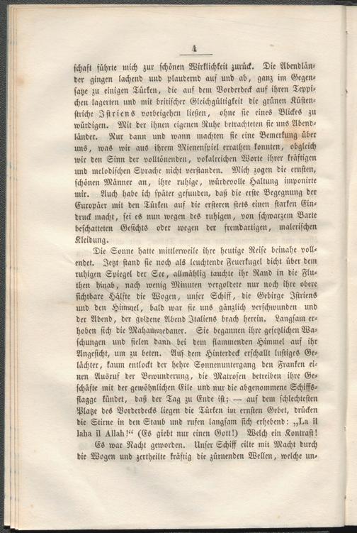 Die Sonne hatte mittlerweile ihre heutige Reise beinahe vollendet. Jetzt stand sie noch als leuchtende Feuerkugel dicht über dein ruhigen Spiegel der See, allmählig tauchte ihr Rand in die Fluchen hiyab, nach wenig Minuten vergoldete nur noch ihre obere sichtbare Hälfte die Wogen, unser Schiff, die Gebirge JstrienS und den Himmel, bald war sie uns gänzlich verschwunden und der Abend, der goldene Abend Italiens brach herein. Langsam erhoben sich die Mohammedaner. Sie begannen ihre gesetzlichen Waschungen und fielen danw bei dem flammenden Himmel auf ihr Angesicht, um zu beten. Arifl dem Hinterdeck erschallt lustiges Gelächter, kaum entlockt der hehre Sonnenuntergang den Franken einen Ausruf der Bewunderung, die Matrosen betreiben ihre Geschäfte mit der gewöhnlichen Eile und nur die abgenommene Schiffsflagge kündet, daß der Tag zu Ende ist; — auf dem schlechtesten Platze des Vorderdecks liegen die Türken im ernsten Gebet, drücken die Stirne in den Staub und rufen langsam sich erhebend: „Da il latm il -ällad!" (Es giebt nur einen Gott!) Welch ein Kontrast!