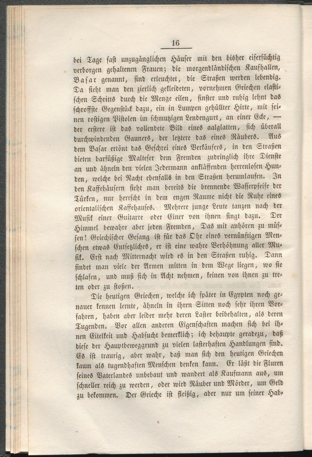 Die heutigen Griechen, welche ich später in Egypten noch genauer kennen lernte, ähneln in ihren Sitten noch sehr ihren Vorfahren, haben aber leider mehr deren Laster beibehalten, als deren Tugenden. Vor allen anderen Eigenschaften machen sich bei ihnen Eitelkeit und Habsucht bemerklich; ich behaupte geradezu, daß diese der Hauptbcweggrund zu vielen lasterhaften Handlungen sind. Es ist traurig, aber wahr, daß man sich den heutigen Griechen kaum als tugendhaften Menschen denken kann. Er läßt die Fluren seines Vaterlandes unbebaut und wandert als Kaufmann auS, um schneller reich zu werden, oder wird Räuber und Mörder, um Geld zu bekommen. Der Grieche ist fleißig, aber nur um seiner Hab-