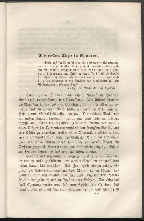 „Diese auf der Ueberfahrt wenig vorbereitete Uebersetzuug von Europa in Afrika; diese plötzlich meinen inneren und äußeren Sinnen vorgezauberte neue Welt, mit ihren ganz neuen Lebensarten und Erscheinungen, für die ich gleichwohl die alten fünf Sinne behielt; das war es eben, was mich die ersten Stunden in den Straßen von Alexandrien wie ein Wachträumen umfangen hat."