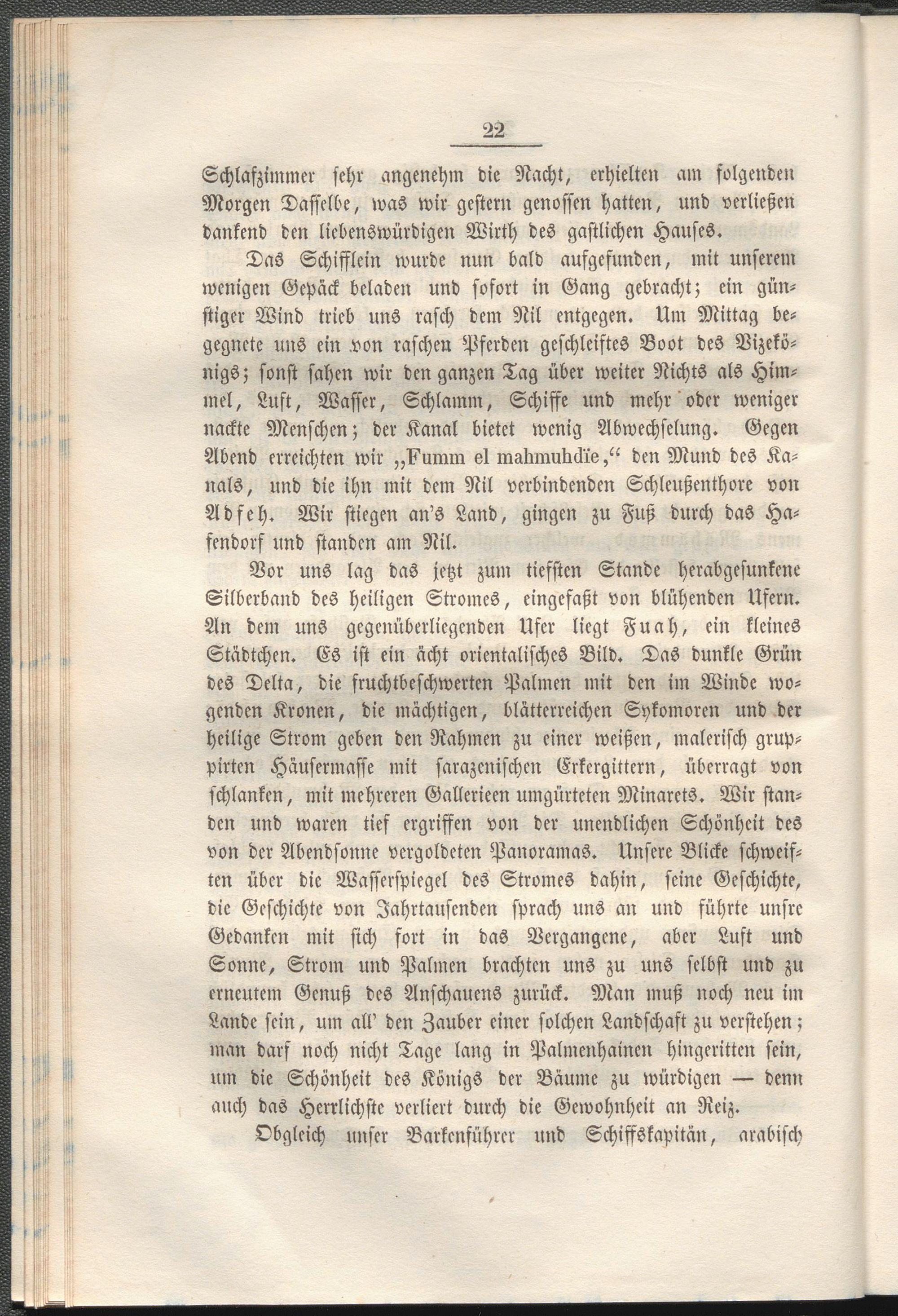 Das Schifflcin wurde nun bald aufgefunden, mit unserem wenigen Gepäck beladen und sofort in Gang gebracht; ein günstiger Wind trieb uns rasch dem Nil entgegen. Um Mittag begegnete uns ein.von raschen Pferden geschleiftes Boot des Vizekönigs; sonst sahen wir den ganzen Tag über weiter Nichts als Himmel, Lust, Wasser, Schlamm, Schiffe und mehr oder weniger nackte Menschen; der Kanal bietet wenig Abwechselung. Gegen Abend erreichten wir „U'umin ei malunudckieden Mund des Kanals, und die ihn mit dem Nil verbindenden Schleußenthvre von Adfeh. Wir stiegen an's Land, gingen zu Fuß durch das Hafendorf und standen am Nil.