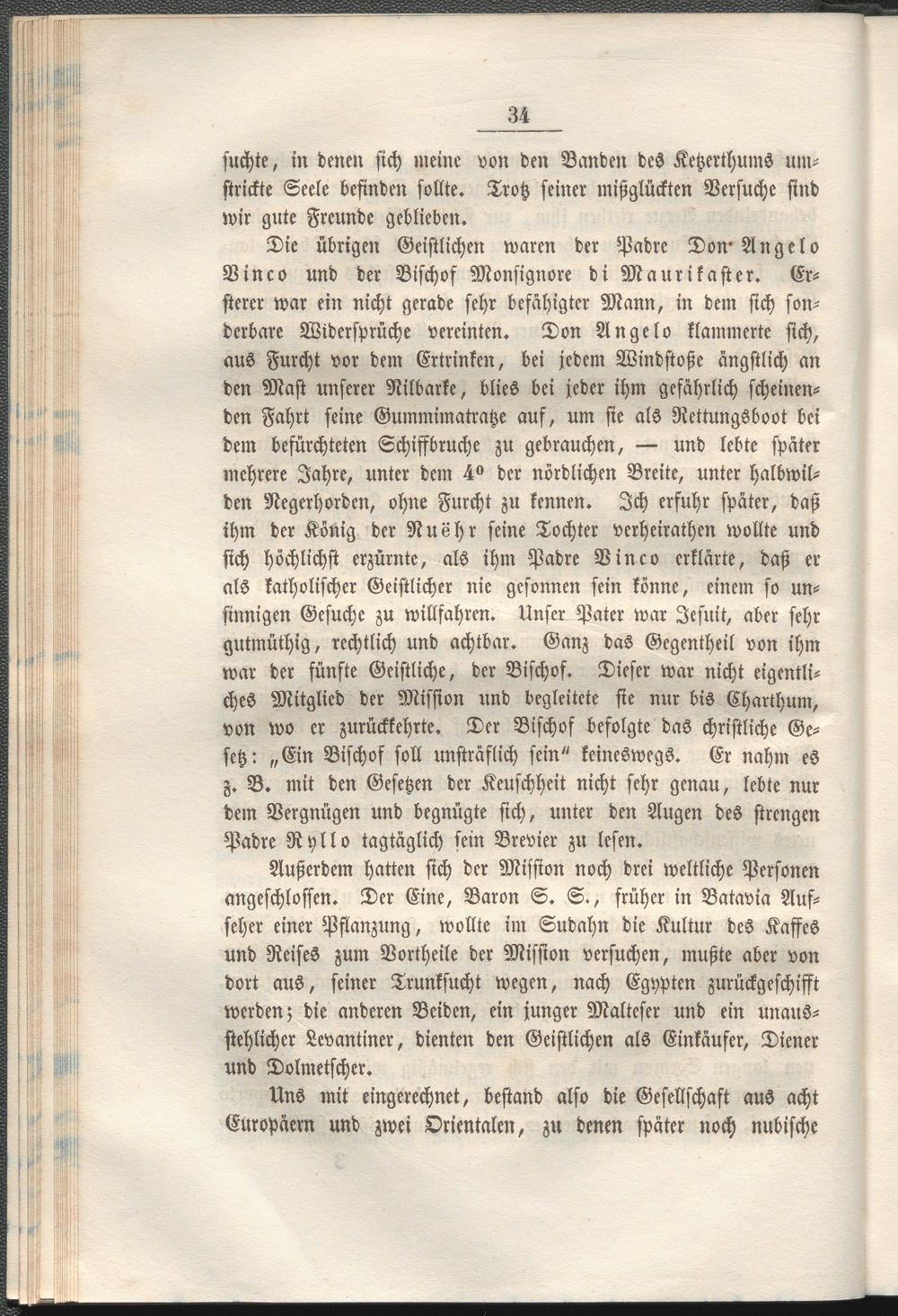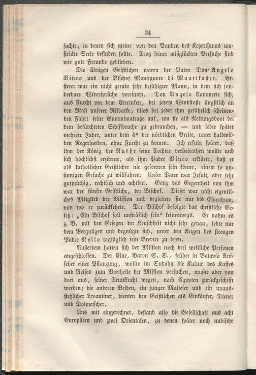 Außerdem hatten sich der Misston noch drei weltliche Personen angeschlossen. Der Eine, Baron S. S>, früher in Batavia Aufseher einer Pflanzung, wollte im Sudahn die Kultur des Kaffes und Reises zum Vortheile der Mission versuchen, mußte aber von dort aus, seiner Trunksucht wegen, nach Egypten zurückgeschifft werden; die anderen Beiden, ein junger Malteser und ein unausstehlicher Levantiner, dienten den Geistlichen als Einkäufer, Diener und Dolmetscher.
