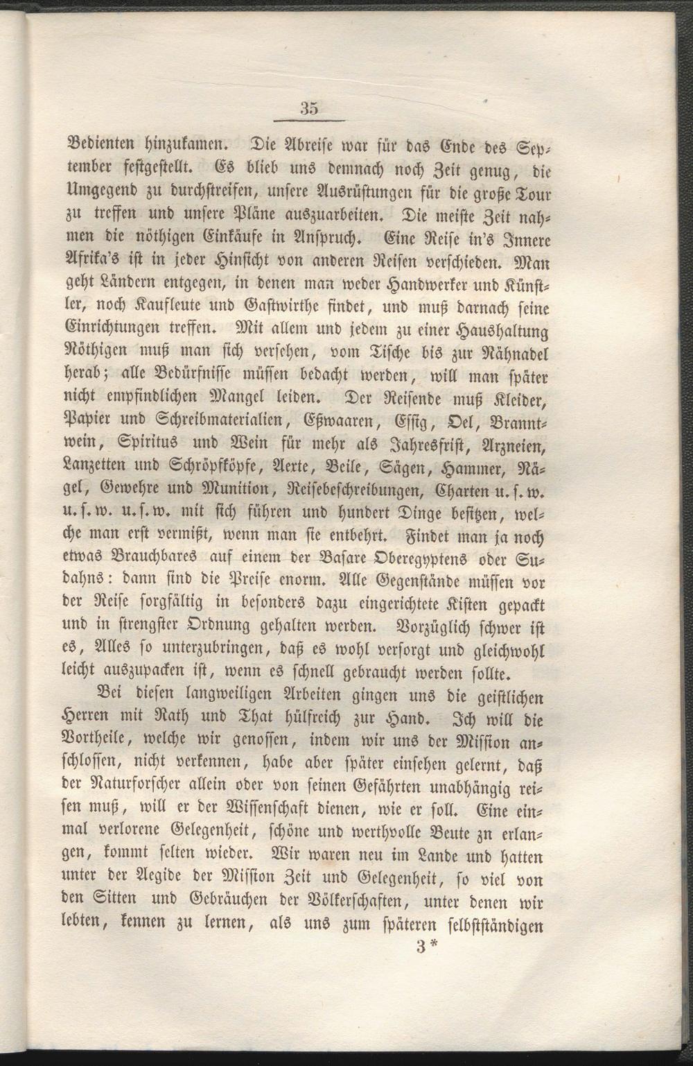 Bedienten hinzukamen. Die Abreise war für das Ende des September festgestellt. Es blieb uns demnach noch Zeit genug, die Umgegend zu durchstreifen, unsere Ausrüstungen für die große Tour zu treffen und unsere Pläne auszuarbeiten. Die meiste Zeit nahmen die nöthigen Einkäufe in Anspruch. Eine Reise in's Innere Afrika's ist in jeder Hinsicht von anderen Reisen verschieden. Man geht Ländern entgegen, in denen man weder Handwerker und Künstler, noch Kaufleute und Gastwirthe findet, und muß darnach seine Einrichtungen treffen. Mit allem und jedem zu einer Haushaltung Nöthigen muß man sich versehen, vom Tische bis zur Nähnadel herab; alle Bedürfnisse müssen bedacht werden, will man später nicht empfindlichen Mangel leiden. Der Reisende muß Kleider, Papier und Schreibmaterialien, Eßwaaren, Essig, Del, Branntwein, Spiritus und Wein für mehr als Jahresfrist, Arzneien, Lanzetten und Schröpfköpfe, Aerte, Beile, Sägen, Hammer, Nagel, Gewehre und Munition, Reisebeschreibungen, Charten u. s. w. u. s. w. u.s. w. mit sich führen und hundert Dinge besitzen, welche man erst vermißt, wenn man sie entbehrt. Findet man ja noch etwas Brauchbares auf einem der Basare Oberegyptens oder Sudahns: dann sind die Preise enorm. Alle Gegenstände müssen vor der Reise sorgfältig in besonders dazu eingerichtete Kisten gepackt und in strengster Ordnung gehalten werden. Vorzüglich schwer ist es, Alles so unterzubringen, daß es wohl versorgt und gleichwohl leicht auszupacken ist, wenn es schnell gebraucht werden sollte.