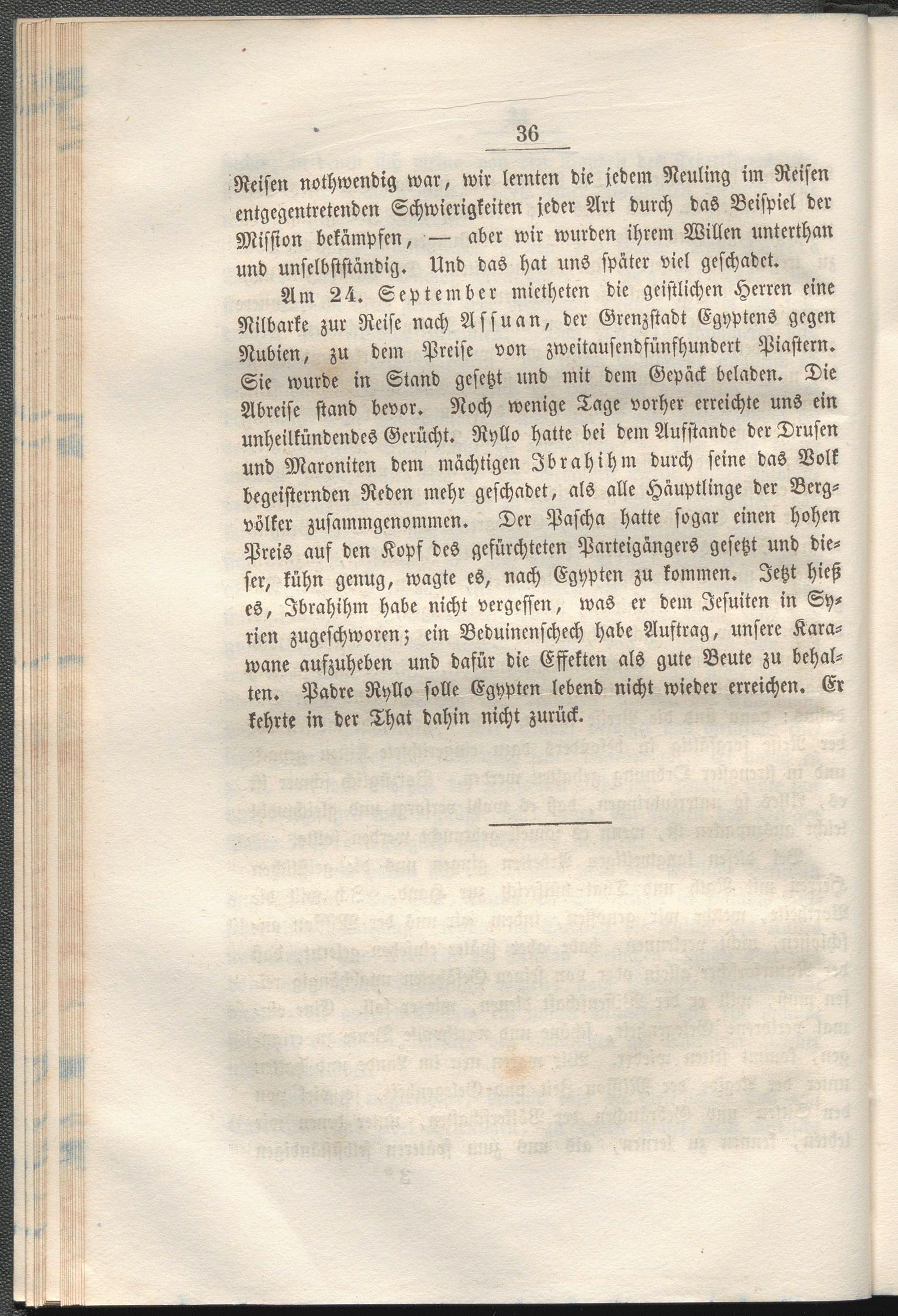 Am 24. September mietheten die geistlichen Herren eine Nilbarke zur Reise nach Assuan, der Grenzstadt Egyptens gegen Nubien, zu dem Preise von zweitausendfünfhundcrt Piastern. Sie wurde in Stand gesetzt und mit dem Gepäck beladen. Die Abreise stand bevor. Noch wenige Tage vorher erreichte uns ein unheilkündendcs Gerücht. Ryllo hatte bei dem Aufstande der Drusen und Maroniten dem mächtigen Jbrahihm durch seine das Volk begeisternden Reden mehr geschadet, als alle Häuptlinge der Bergvölker zusammgenommen. Der Pascha hatte sogar einen hohen Preis auf den Kopf des gefürchtetcn Parteigängers gesetzt und dieser, kühn genug, wagte es, nach Egypten zu kommen. Jetzt hieß es, Jbrahihm habe nicht vergessen, was er dem Jesuiten in Syrien zugeschworen; ein Beduincnschech habe Auftrag, unsere Karawane aufzuheben und dafür die Effekten als gute Beute zu behalten. Padre Ryllo solle Egypten lebend nicht wieder erreichen. Er kehrte in der That dahin nicht zurück.