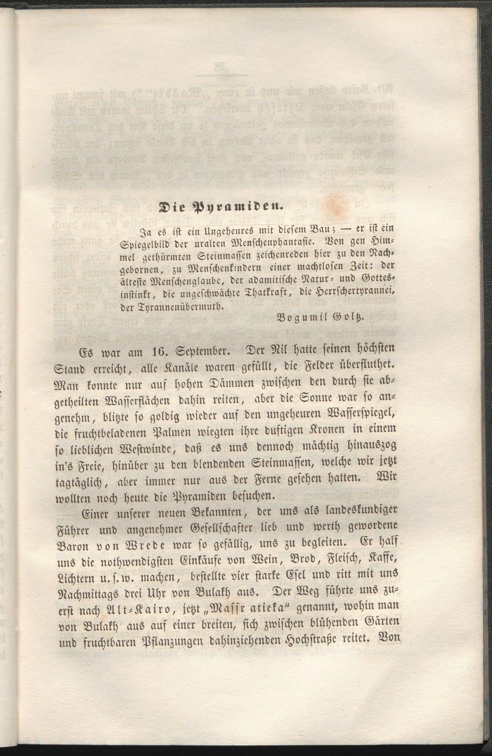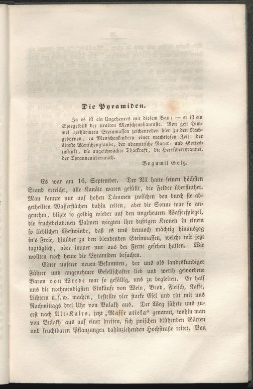 Einer unserer neuen Bekannten, der uns als landeskundiger Führer und angenehmer Gesellschafter lieb und werth gewordene Baron von Wrede war so gefällig, uns zu begleiten. Er half uns die nothwendigsten Einkäufe von Wein, Brod, Fleisch, Kasse, Lichtern u.s.w. machen, bestellte vier starke Esel und ritt mit unS Nachmittags drei Uhr von Bulakh aus. Der Weg führte uns zuerst nach Alt-Kairo, jetzt „Massr atieka" genannt, wohin man von Bulakh aus auf einer breiten, sich zwischen blühenden Gärten und fruchtbaren Pflanzungen dahinziehenden Hochstraße reitet. Von