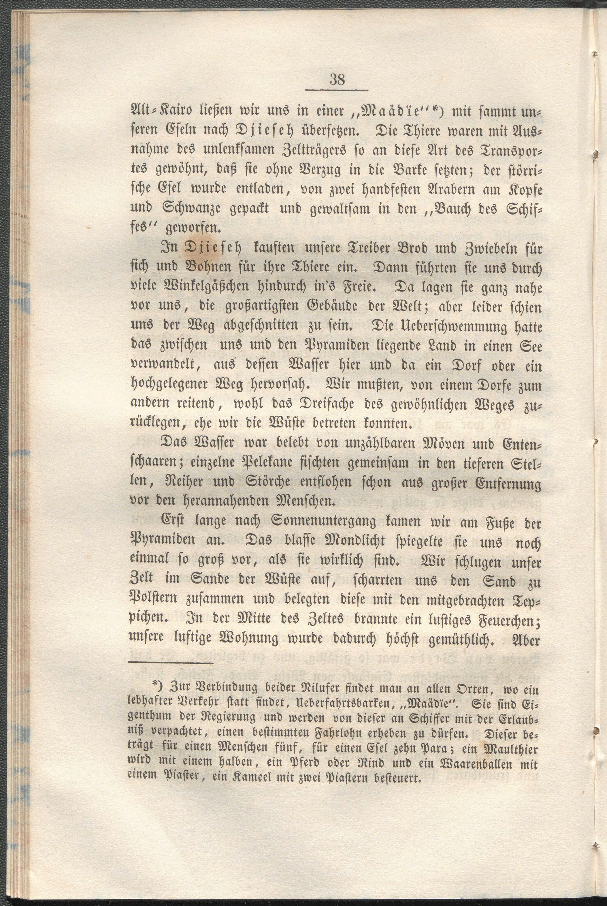Alt-Kairo ließen wir uns in einer „Maäd'ie"*) mit sammt unseren Eseln nach Djieseh übersetzen. Die Thiere waren mit Ausnahme des unlenksamen Zeltträgers so an diese Art des Transpor- tes gewöhnt, daß sie ohne Verzug in die Barke setzten; der störrische Esel wurde entladen, von zwei handfesten Arabern am Kopfe und Schwänze gepackt und gewaltsam in den ,,Bauch des Schiffes" geworfen.