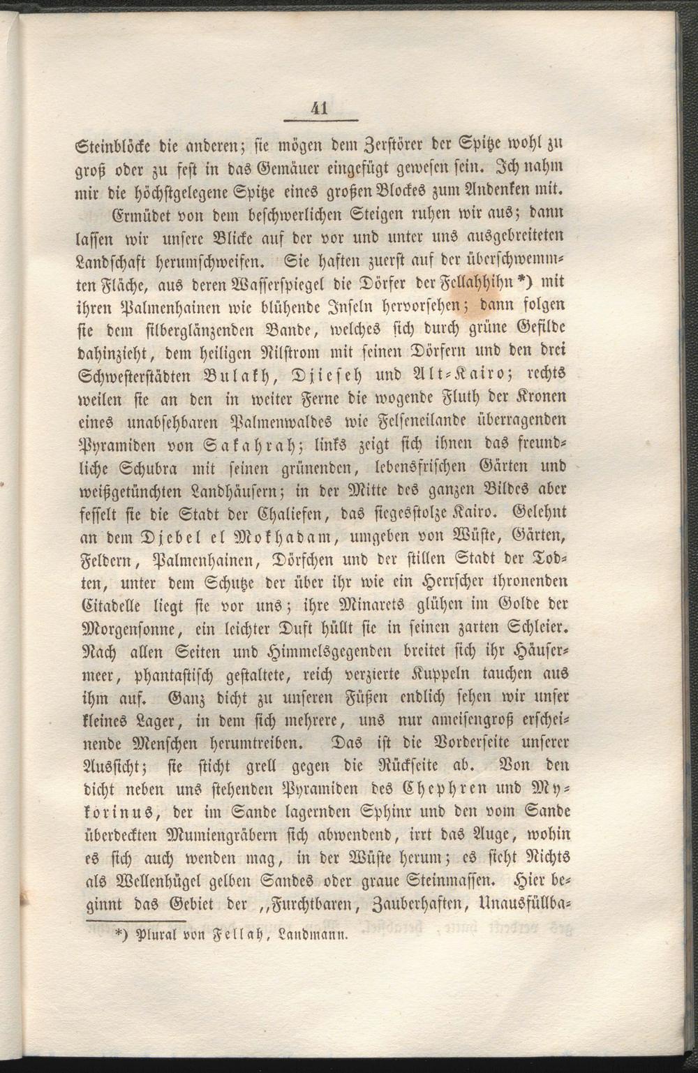 Ermüdet von dem beschwerlichen Steigen ruhen wir aus; dann lassen wir unsere Blicke auf der vor und unter uns ausgebreiteten Landschaft heruinschwcifcn. Sie haften zuerst auf der überschwemmten Fläche, aus deren Wasserspiegel die Dörfer der Fcllahhihn *) mit ihren Palmenhaincn wie blühende Inseln hervorgehen; dann folgen sie dem silberglänzenden Bande, welches sich durch grüne Gefilde dahinzieht, dem heiligen Nilstrom mit seinen Dörfern und den drei Schwesterstädten Bulakh, Dsie seh und Alt-Kairo; rechts weilen sie an den in weiter Ferne die wogende Fluch der Kronen eines unabsehbaren Palmenwaldcs wie Fclsencilande überragenden Pyramiden von Sakahrah; links zeigt sich ibncn das freundliche Schubra mit seinen grünenden, lcbcnsfrischen Gärten und wcißgetünchten Landhäusern; in der Mitte des ganzen Bildes aber fesselt sie die Stadt der Chaliefen, das siegeSstolze Kairo. Gelehnt an dem Djcbel el Mokhadam, umgeben von Wüste, Gärten, Feldern, Palmenhaincn, Dörfchen und der stillen Stadt der Todten, unter dem Schutze der über ihr wie ein Herrscher thronenden Citadelle liegt sie vor uns; ihre Minarets glühen im Golde der Morgensonne, ein leichter Duft hüllt sie in seinen zarten Schleier. Nach allen Seiten und Himmelsgegenden breitet sich ihr Häuscr- meer, phantastisch gestaltete, reich verzierte Kuppeln tauchen aus ihm auf. Ganz dicht zu unseren Füßen endlich sehen wir unser kleines Lager, in dem sich mehrere, uns nur ameiscngroß erscheinende Menschen herumtreiben. Das ist die Vorderseite unserer Aussicht; sie sticht grell gegen die Rückseite ab. Von den dicht neben uns stehenden Pyramiden des Chephrcn und My- korinus, der im Sande lagernden Sphinr und den vom Sande überdeckten Mumiengräbern sich abwendend, irrt das Auge, wohin es sich auch wenden mag, in der Wüste herum; es sieht Nichts als Wellenhügcl gelben Sandes oder graue Steinmassen. Hier beginnt das Gebiet der ,,Furchtbaren, Zauberhaften, Unausfüllba-