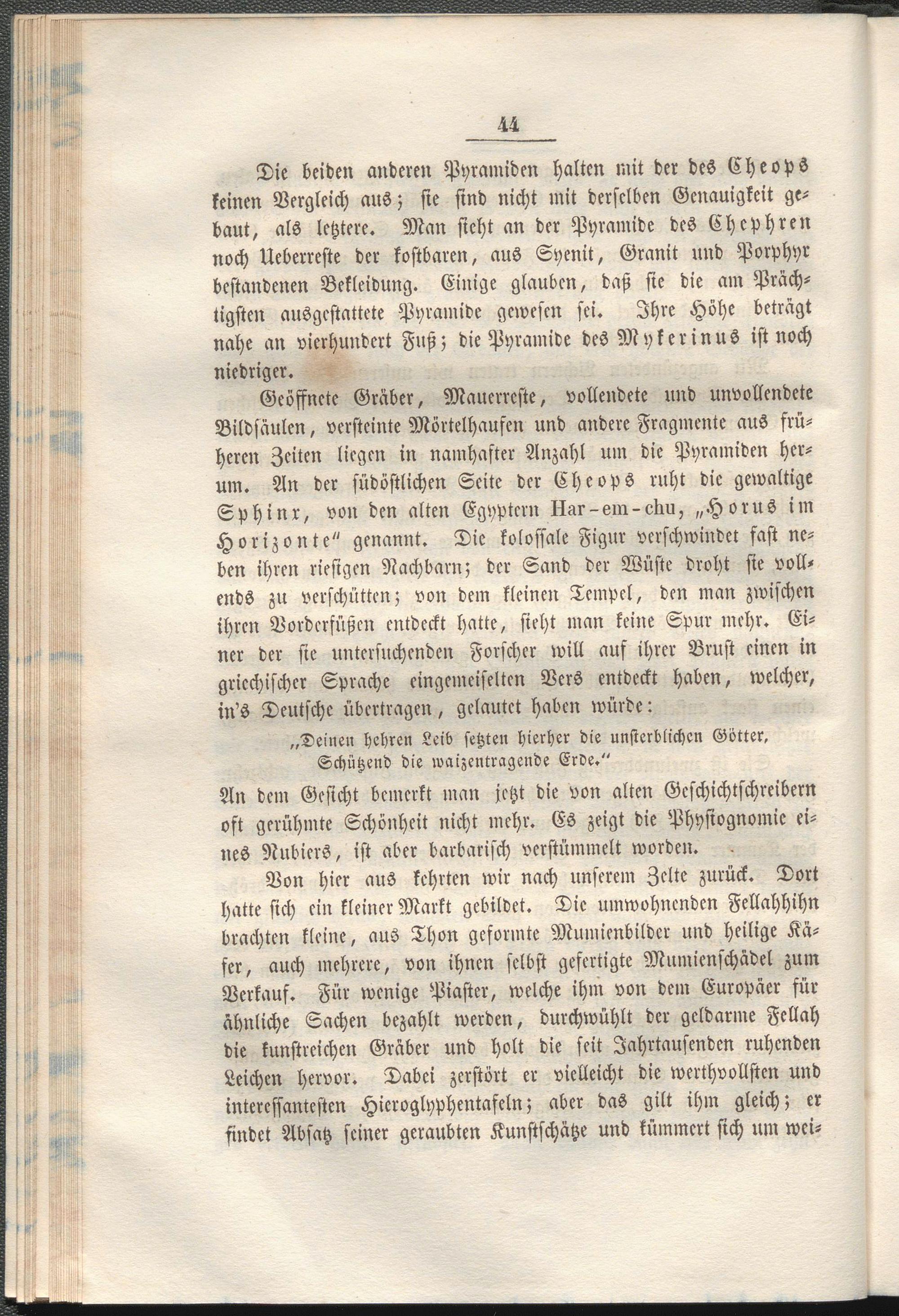 Geöffnete Gräber, Maucrrcste, vollendete und unvollendete Bildsäulen, versteinte Mörtelhaufcn und andere Fragmente aus früheren Zeiten liegen in namhafter Anzahl um die Pyramiden herum. An der südöstlichen Seite der Cheops ruht die gewaltige Sphinr, von den alten Egyptcrn Har-sm-ellu, „Horns im Horizonte" genannt. Die kolossale Figur verschwindet säst neben ihren riesigen Nachbarn; der Sand der Wüste droht sie vollends zu verschütten; von dem kleinen Tempel, den man zwischen ihren Vorderfüßcn entdeckt hatte, sieht man keine Spur mehr. Einer der sie untersuchenden Forscher will auf ihrer Brust einen in griechischer Sprache eingemeiselten Vers entdeckt haben, welcher, in's Deutsche übertragen, gelautet haben würde: