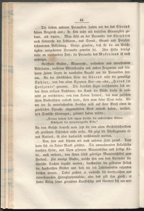 Die beiden anderen Pyramiden halten mit der des Cheops keinen Vergleich aus; sie sind nicht mit derselben Genauigkeit gebaut, als letztere. Man sieht an der Pyramide des Chcphren noch Ueberreste der kostbaren, aus Syenit, Granit und Porphyr bestandenen Bekleidung. Einige glauben, daß sie die am Prächtigsten ausgestattete Pyramide gewesen sei. Ihre Höhe beträgt nahe an vierhundert Fuß; die Pyramide des Mykerinus ist noch niedriger.