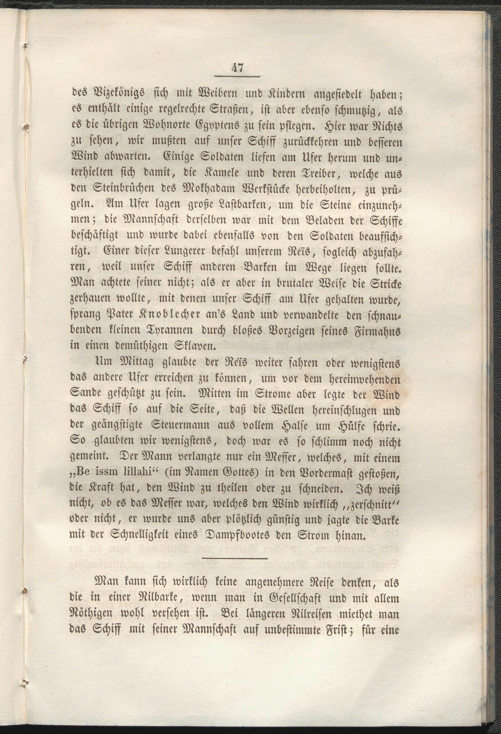 des Vizekönigs sich mit Weibern und Kindern angesiedelt haben; es enthält einige regelrechte Straßen, ist aber ebenso schmutzig, als es die übrigen Wohnorte Egyptcns zu sein Pflegen. Hier war Nichts zu sehen, wir mußten auf unser Schiff zurückkehren und besseren Wind abwarten. Einige Soldaten liefen am Ufer herum und unterhielten sich damit, die Kamele und deren Treiber, welche aus den Steinbrüchen des Mokhadam Werkstücke herbeiholten, zu prügeln. Am Ufer lagen große Lastbarken, um die Steine einzunehmen; die Mannschaft derselben war mit dem Beladen der Schiffe beschäftigt und wurde dabei ebenfalls von den Soldaten beaufsichtigt. Einer dieser Lungerer befahl unserem Reis, sogleich abzufahren, weil unser Schiff anderen Barken im Wege liegen sollte. Man achtete seiner nicht; als er aber in brutaler Weise die Stricke zerhauen wollte, mit denen unser Schiff am Ufer gehalten wurde, sprang Pater Knoblecher an's Land und verwandelte den schnaubenden kleinen Tyrannen durch bloßes Vorzeigen seines Firmahns in einen demüthigen Sklaven.