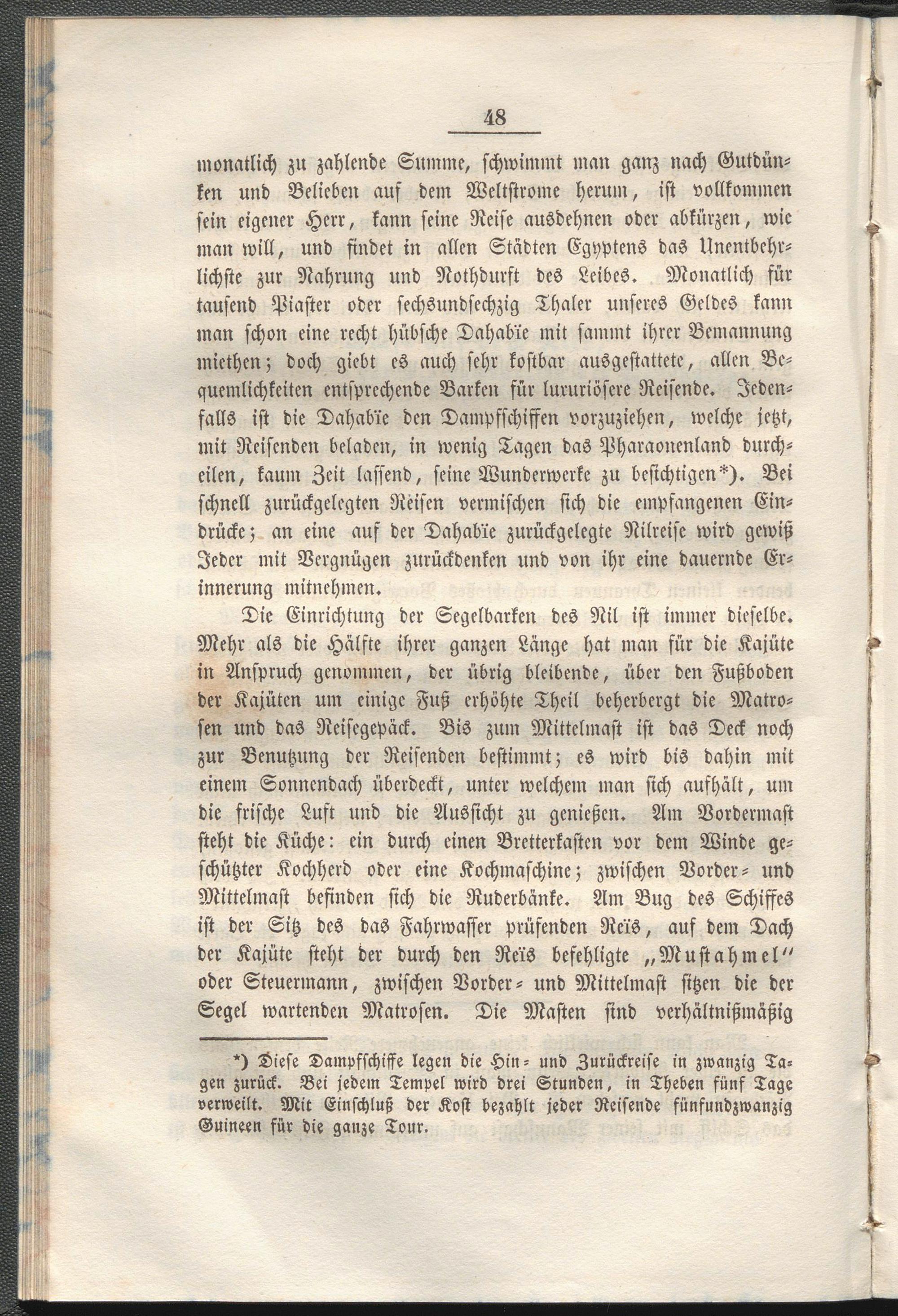 monatlich zu zahlende Summe, schwimmt man ganz nach Gutdünken und Belieben auf dem Weltstrome herum, ist vollkommen sein eigener Herr, kann seine Reise ausdehnen oder abkürzen, wie man will, und findet in allen Städten Egyptens das Unentbehrlichste zur Nahrung und Nothdurft des Leibes. Monatlich für tausend Piaster oder sechsundsechzig Thaler unseres Geldes kann man schon eine recht hübsche Dahabie mit sammt ihrer Bemannung miethen; doch giebt es auch sehr kostbar ausgestattete, allen Bequemlichkeiten entsprechende Barken für lururiöscre Reisende. Jedenfalls ist die Dahabre den Dampfschiffen vorzuziehen, welche jetzt, mit Reisenden beladen, in wenig Tagen das Pharaonenland durcheilen, kaum Zeit lassend, seine Wunderwerke zu besichtigen*). Bei schnell zurückgelegten Reisen vermischen sich die empfangenen Eindrücke; an eine auf der Dahabie zurückgelegte Nilreise wird gewiß Jeder mit Vergnügen zurückdenken und von ihr eine dauernde Erinnerung mitnehmen.