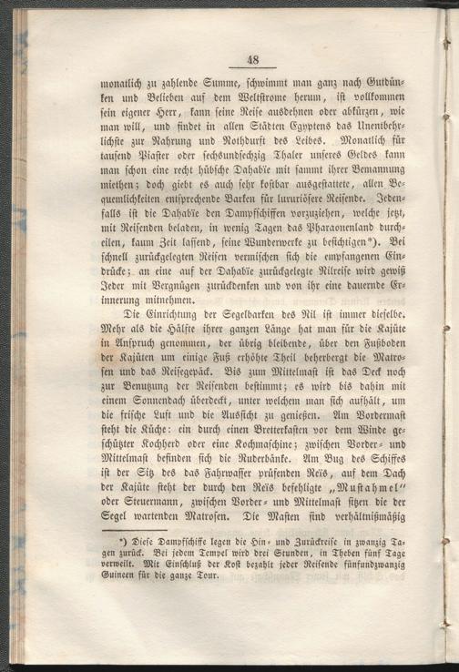*) Diese Dampfschiffe legen die Hin- und Zurückreise in zwanzig Tagen zurück. Bei jedem Tempel wird drei Stunden, in Theben fünf Tage verweilt. Mit Einschluß der Kost bezahlt jeder Reisende fünfundzwanzig Guineen für die ganze Tour.