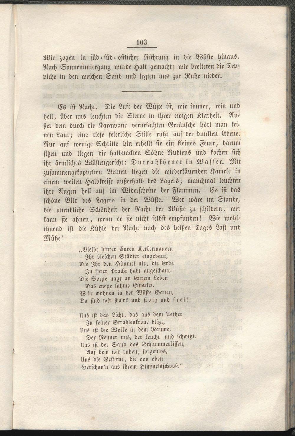 Es ist Nacht. Die Luft der Wüste ist, wie immer, rein und hell, über uns leuchten die Sterne in ihrer ewigen Klarheit. Außer dem durch die Karawane verursachten Geräusche hört man keinen Laut; eine tiefe feierliche Stille ruht auf der dunklen Ebene. Nur auf wenige Schritte hin erhellt sie ein kleines Feuer, darum sitzen und liegen die halbnackten Söhne Nubiens und kochen sich ihr ärmliches Wüstcngericht: Dürr ah körn er in Wasser. Mit zusammengekoppcltcn Beinen liegen die wiederkäuenden Kamele in einem weiten Halbkreise außerhalb des Lagers; manchmal leuchten ihre Augen hell auf im Widerscheine der Flammen. Es ist das schöne Bild des Lagers in der Wüste. Wer wäre im Stande, die unendliche Schönheit der Nacht der Wüste zu schildern, wer kann sie ahnen, wenn er sie nicht selbst empfunden! Wie wohlthuend ist die Kühle der Nacht nach des heißen Tages Last und Mühe!
