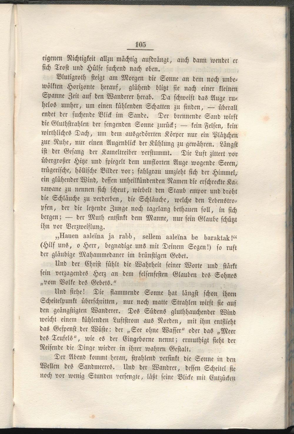 Blutigroth steigt am Morgen die Sonne an dem noch unbewölkten Horizonte herauf, glühend blitzt sie nach einer kleinen Spanne Zeit auf den Wanderer herab. Da schweift das Auge ruhelos umher, um einen kühlenden Schatten zu finden, — überall endet der suchende Blick im Sande. Der brennende Sand wirst die Gluthstrahlen der sengenden Sonne zurück; — kein Felsen, kein wirthliches Dach, um dem ausgedörrten Körper nur ein Plätzchen zur Ruhe, nur einen Augenblick der Kühlung zu gewähren. Längst ist der Gesang der Kameltreiber verstummt. Die Luft zittert vor übergroßer Hitze und spiegelt dem umflorten Auge wogende Seeen, trügerische, höllische Bilder vor; fahlgrau umzieht sich der Himmel, ein glühender Wind, dessen unheilkündenden Namen die erschreckte Karawane zu nennen sich scheut, wirbelt den Staub empor und droht die Schläuche zu verderben, die Schläuche, welche den Lcbenstro- pfen, der die letzende Zunge noch tagelang bcthauen soll, in sich bergen; — der Muth entsinkt dem Manne, nur sein Glaube schützt ihn vor Verzweiflung.