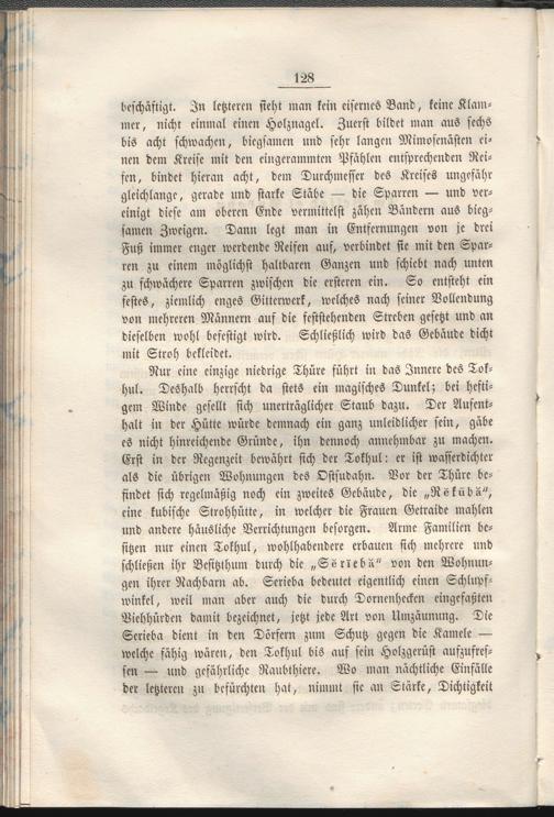 Nur eine einzige niedrige Thüre führt in das Innere des Tok- hul. Deshalb herrscht da stets ein magisches Dunkel; bei heftigem Winde gesellt sich unerträglicher Staub dazu. Der Aufenthalt in der Hütte würde demnach ein ganz unleidlicher sein, gäbe es nicht hinreichende Gründe, ihn dennoch annehmbar zu machen. Erst in der Regenzeit bewährt sich der Tokhul: er ist wasserdichter als die übrigen Wohnungen des Ostsudahn. Vor der Thüre befindet sich regelmäßig noch ein zweites Gebäude, die „RekübL", eine kubische Strohhütte, in welcher die Frauen Getraide mahlen und andere häusliche Verrichtungen besorgen. Arme Familien besitzen nur einen Tokhul, wohlhabendere erbauen sich mehrere und schließen ihr Besitzthum durch die „Ssrrebä" von den Wohnungen ihrer Nachbarn ab. Serieba bedeutet eigentlich einen Schlupfwinkel, weil man aber auch die durch Dornenhecken eingefaßten Viehhürdcn damit bezeichnet, jetzt jede Art von Umzäunung. Die Serieba dient in den Dörfern zum Schutz gegen die Kamele — welche fähig wären, den Tokhul bis auf sein Holzgerüst aufzufressen — und gefährliche Raubthicre. Wo man nächtliche Einfälle der letzteren zu befürchten hat, nimmt sie an Stärke, Dichtigkeit