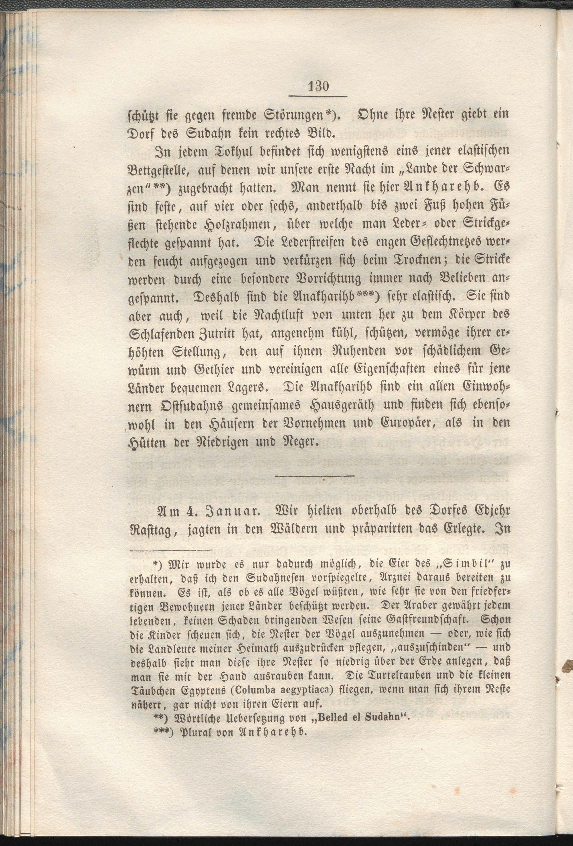 In jedem Tokhul befindet sich wenigstens eins jener elastischen Bettgestelle, auf denen wir unsere erste Nacht im „Lande der Schwarzen"**) zugebracht hatten. Man nennt sie hier Ankharehb. ES sind feste, auf vier oder sechs, anderthalb bis zwei Fuß hohen Füßen stehende Holzrahmen, über welche man Leder- oder Strickgeflechte gespannt hat. Die Lcderstrcifcn des engen Geflechtnetzes werden feucht aufgezogen und verkürzen sich beim Trocknen; die Stricke werden durch eine besondere Vorrichtung immer nach Belieben angespannt. Deshalb sind die Anakharihb***) sehr elastisch. Sie sind aber auch, weil die Nachtluft von unten her zu dem Körper des Schlafenden Zutritt hat, angenehm kühl, schützen, vermöge ihrer erhöhten Stellung, den auf ihnen Ruhenden vor schädlichem Gewürm und Gethier und vereinigen alle Eigenschaften eines für jene Länder bequemen Lagers. Die Anakharihb sind ein allen Einwohnern Ostsudahns gemeinsames Hausgeräth und finden sich ebensowohl in den Häusern der Vornehmen und Europäer, als in den Hütten der Niedrigen und Neger.