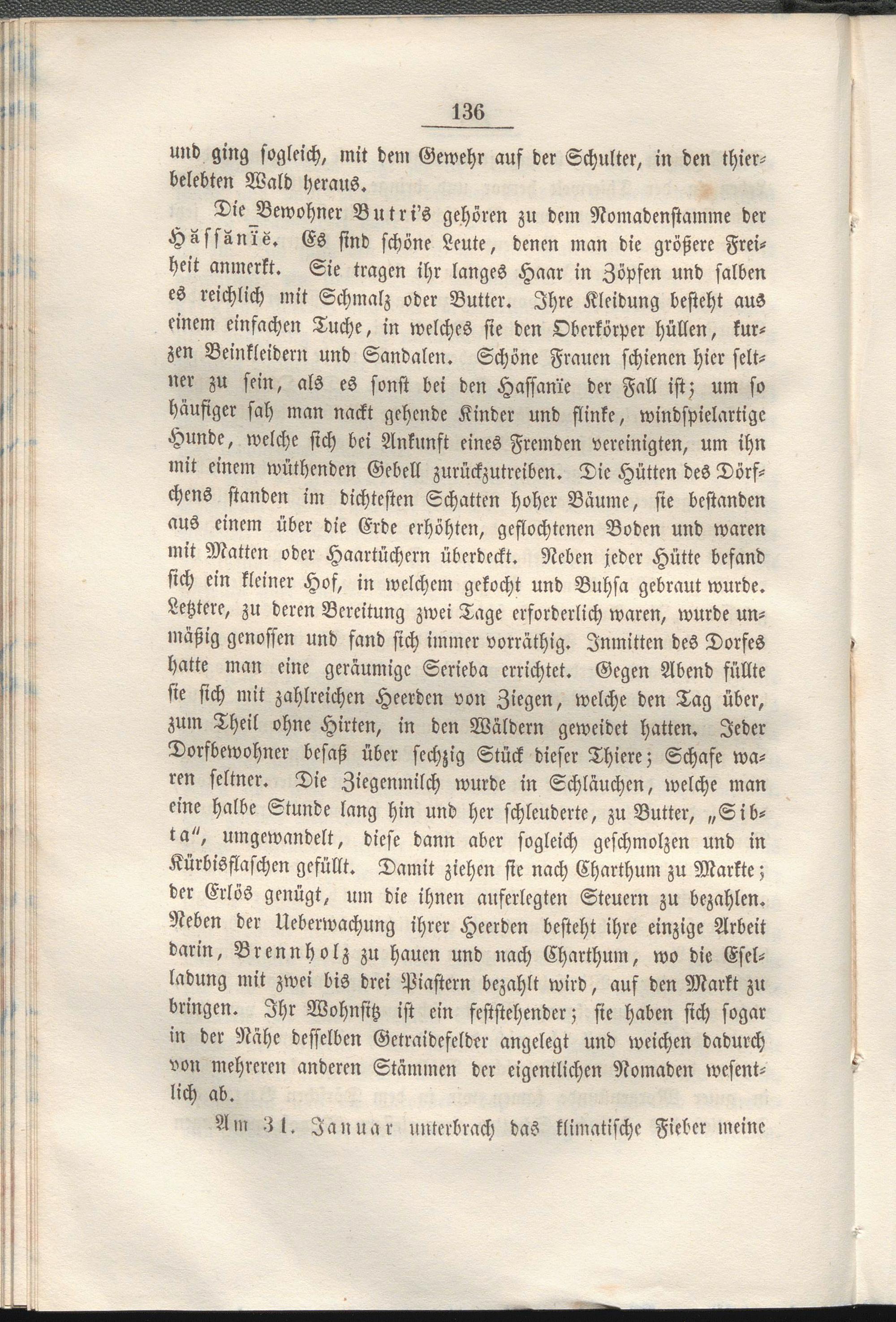 Die Bewohner Butri's gehören zu dem Nomadenstamme der Hsssän'ie. Es sind schöne Leute, denen man die größere Freiheit anmerkt. Sie tragen ihr langes Haar in Zöpfen und salben es reichlich mit Schmalz oder Butter. Ihre Kleidung besteht aus einem einfachen Tuche, in welches sie den Oberkörper hüllen, kurzen Beinkleidern und Sandalen. Schöne Frauen schienen hier seltner zu sein, als es sonst bei den Hassame der Fall ist; um so häufiger sah man nackt gehende Kinder und flinke, windspielartigc Hunde, welche sich bei Ankunft eines Fremden vereinigten, um ihn mit einem wüthenden Gebell zurückzutreiben. Die Hütten des Dörfchens standen im dichtesten Schatten hoher Bäume, sie bestanden aus einem über die Erde erhöhten, geflochtenen Boden und waren mit Matten oder Haartüchern überdeckt. Neben jeder Hütte befand sich ein kleiner Hof, in welchem gekocht und Buhsa gebraut wurde. Letztere, zu deren Bereitung zwei Tage erforderlich waren, wurde unmäßig genossen und fand sich immer vorräthig. Inmitten des Dorfes hatte man eine geräumige Scrieba errichtet. Gegen Abend füllte sie sich mit zahlreichen Heerdcn von Ziegen, welche den Tag über, zum Theil ohne Hirten, in den Wäldern geweidet hatten. Jeder Dorfbewohner besaß über sechzig Stück dieser Thiere; Schafe waren seltner. Die Ziegenmilch wurde in Schläuchen, welche man eine halbe Stunde lang hin und her schleuderte, zu Butter, „S ib- ta", umgewandelt, diese dann aber sogleich geschmolzen und in Kürbisflaschen gefüllt. Damit ziehen sie nach Charthum zu Markte; der Erlös genügt, um die ihnen auferlegten Steuern zu bezahlen. Neben der Ueberwachung ihrer Heerden besteht ihre einzige Arbeit darin, Brennholz zu hauen und nach Charthum, wo die Eselladung mit zwei bis drei Piastern bezahlt wird, auf den Markt zu bringen. Ihr Wohnsitz ist ein feststehender; sie haben sich sogar in der Nähe desselben Getraidefelder angelegt und weichen dadurch von mehreren anderen Stämmen der eigentlichen Nomaden wesentlich ab.