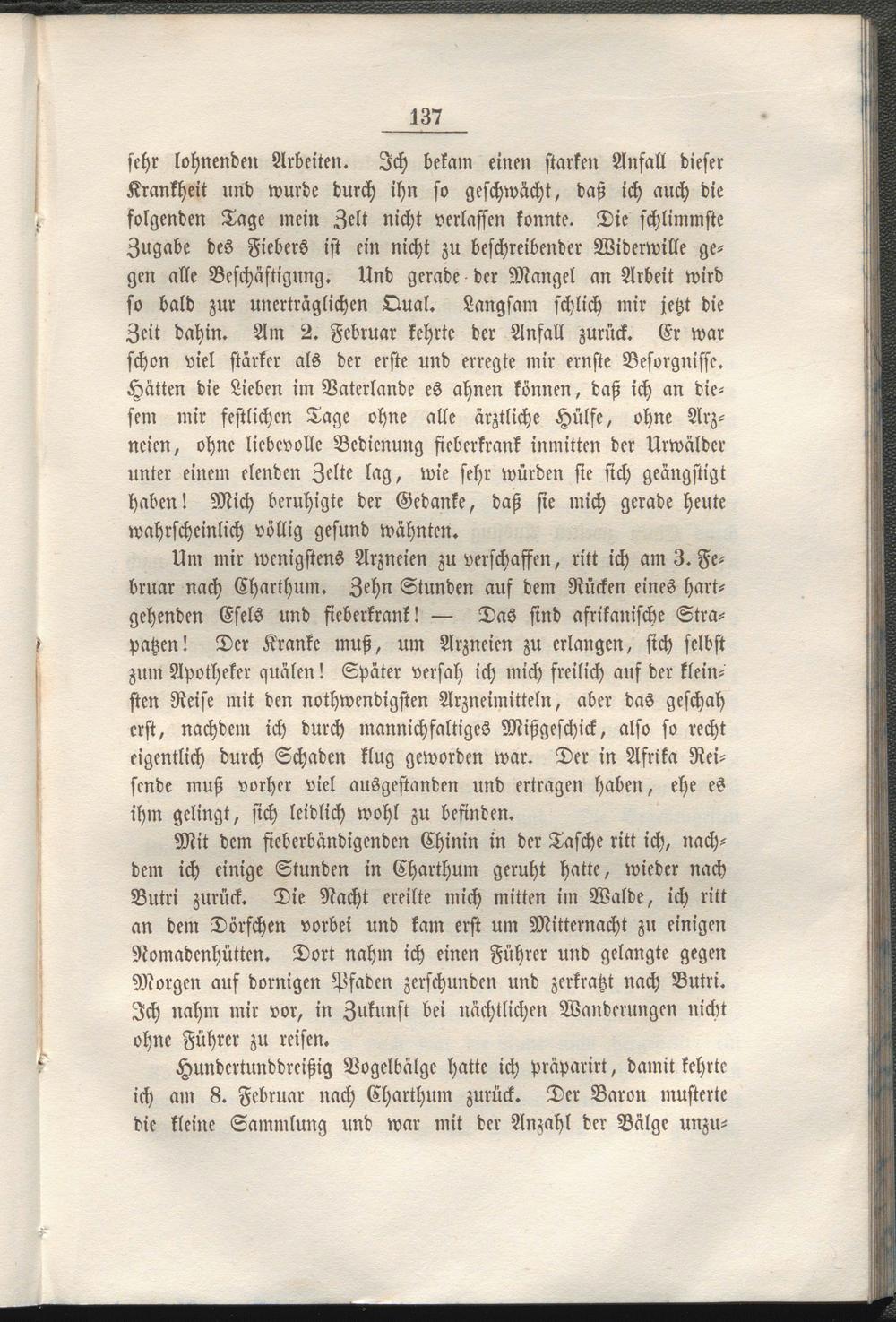 sehr lohnenden Arbeiten. Ich bekam einen starken Anfall dieser Krankheit und wurde durch ihn so geschwächt, daß ich auch die folgenden Tage mein Zelt nicht verlassen konnte. Die schlimmste Zugabe des Fiebers ist ein nicht zu beschreibender Widerwille gegen alle Beschäftigung. Und gerade der Mangel an Arbeit wird so bald zur unerträglichen Qual. Langsam schlich mir jetzt die Zeit dahin. Am 2. Februar kehrte der Anfall zurück. Er war schon viel stärker als der erste und erregte mir ernste Besorgnisse. Hätten die Lieben im Vaterlande es ahnen können, daß ich an diesem mir festlichen Tage ohne alle ärztliche Hülfe, ohne Arzneien, ohne liebevolle Bedienung fieberkrank inmitten der Urwälder unter einem elenden Zelte lag, wie sehr würden sie sich geängstigt haben! Mich beruhigte der Gedanke, daß sie mich gerade heute wahrscheinlich völlig gesund wähnten.