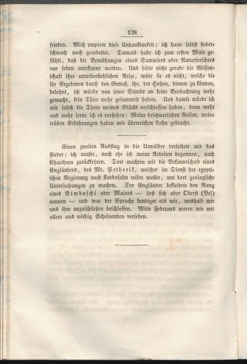 Einen zweiten Ausflug in die Urwälder verleidete mir das Fieber; ich mußte, noch ehe ich meine Arbeiten begonnen, nach Charthum zurückkehren. Dort machten wir die Bekanntschaft eines Engländers, des Mr. Petherik, welcher im Dienst der egypti- schcn Regierung nach Kordofahn reisen wollte, um dort geologische Untersuchungen zu machen. Der Engländer bekleidete den Rang eines Bimbaschi oder Majors — ließ sich aber Oberst (Bei) nennen — und war der Sprache kundiger als wir, weshalb wir uns ihm anzuschließen beschlossen. Mitte Februars waren wir mit allem unS nöthig Scheinenden versehen.