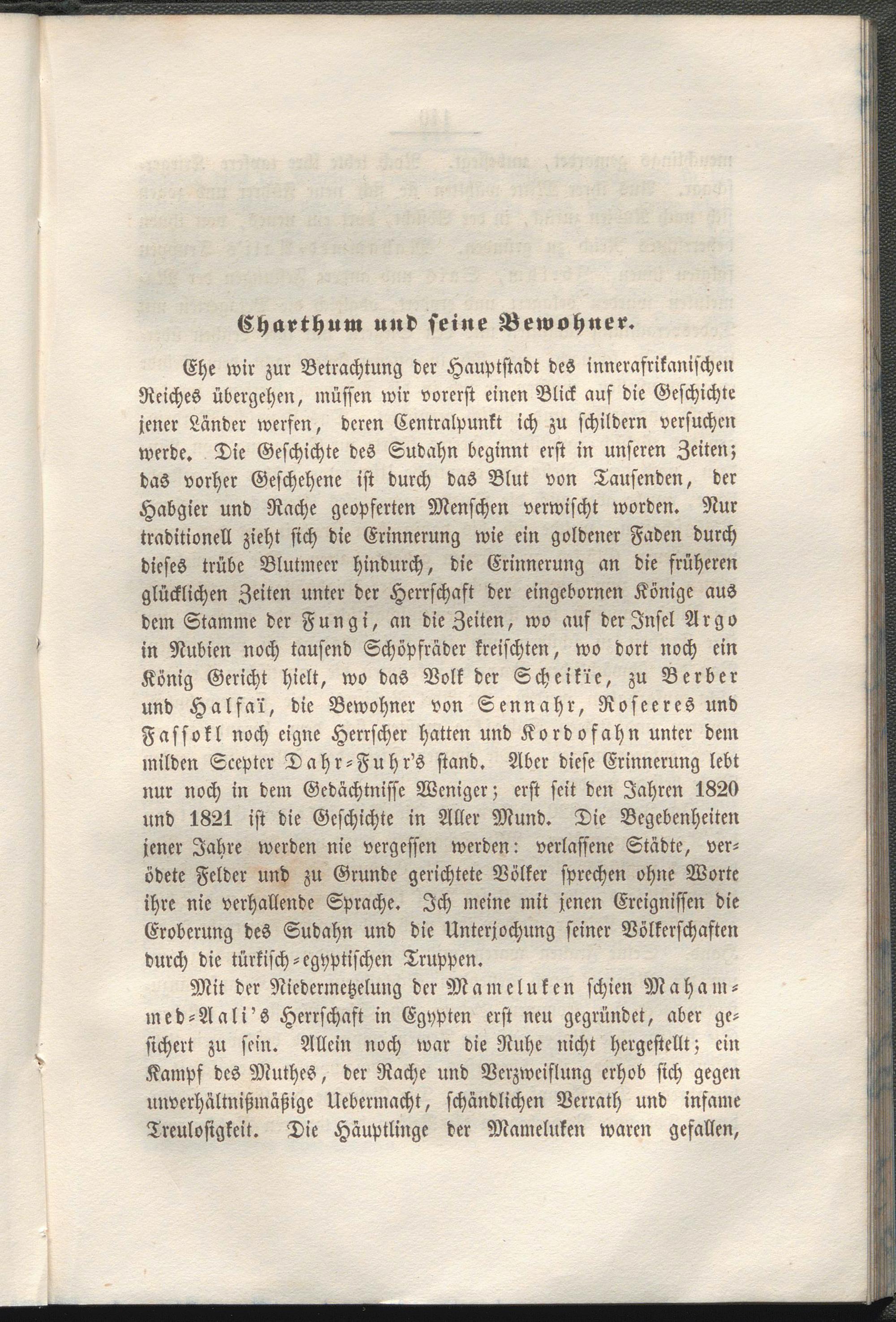 Ehe wir zur Betrachtung der Hauptstadt des inncrafrikanischen Reiches übergehen, müssen wir vorerst einen Blick auf die Geschichte jener Länder werfen, deren Centralpunkt ich zu schildern versuchen werde. Die Geschichte des Sudahn beginnt erst in unseren Zeiten; das vorher Geschehene ist durch das Blut von Tausenden, der Habgier und Rache geopferten Menschen verwischt worden. Nur traditionell zieht sich die Erinnerung wie ein goldener Faden durch dieses trübe Blutmecr hindurch, die Erinnerung an die früheren glücklichen Zeiten unter der Herrschaft der eingebornen Könige aus dem Stamme der Fungi, an die Zeiten, wo auf der Insel Arg» in Nubien noch tausend Schöpfräder kreischten, wo dort noch ein König Gericht hielt, wo das Volk der Scheine, zu Berber und Halfa'i, die Bewohner von Sennahr, Roseeres und Fassokl noch eigne Herrscher hatten und Kordofahn unter dem milden Scepter Dahr-Fuhr's stand. Aber diese Erinnerung lebt nur noch in dem Gedächtnisse Weniger; erst seit den Jahren 1820 und 1821 ist die Geschichte in Aller Mund. Die Begebenheiten jener Jahre werden nie vergessen werden: verlassene Städte, verödete Felder und zu Grunde gerichtete Völker sprechen ohne Worte ihre nie verhallende Sprache. Ich meine mit jenen Ereignissen die Eroberung des Sudahn und die Unterjochung seiner Völkerschaften durch die türkisch-egyptischen Truppen.