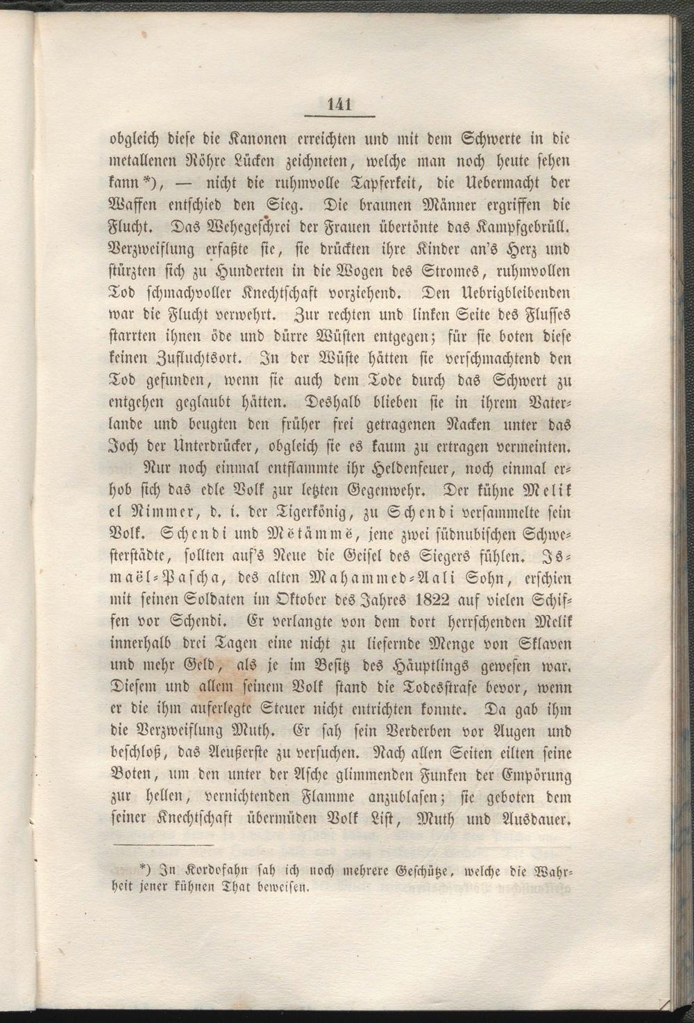 Nur noch einmal entflammte ihr Heldenfeuer, noch einmal erhob sich daS edle Volk zur letzten Gegenwehr. Der kühne Melik cl Nimmer, d. i. der Tigerkönig, zu Schcndi versammelte sein Volk. Schcndi und MLtämms, jene zwei südnubischcn Schwesterstädte, sollten auss Neue die Geisel des Siegers fühlen. Jörn aöl-Pascha, des alten Mahammed-Aali Sohn, erschien mit seinen Soldaten im Oktober des Jahres 1822 auf vielen Schissen vor Schcndi. Er verlangte von dem dort herrschenden Melik innerhalb drei Tagen eine nicht zu liefernde Menge von Sklaven und mehr Geld, als je im Besitz des Häuptlings gewesen war. Diesem und allem seinem Volk stand die Todesstrafe bevor, wenn er die ihm auferlegte Steuer nicht entrichten konnte. Da gab ihm die Verzweiflung Muth. Er sah sein Verderben vor Augen und beschloß, das Aeußerste zu versuche». Nach allen Seiten eilten seine Boten, um den unter der Asche glimmenden Funken der Empörung zur hellen, vernichtenden Flamme anzublasen; sie geboten dem seiner Knechtschaft übermüden Volk List, Muth und Ausdauer.