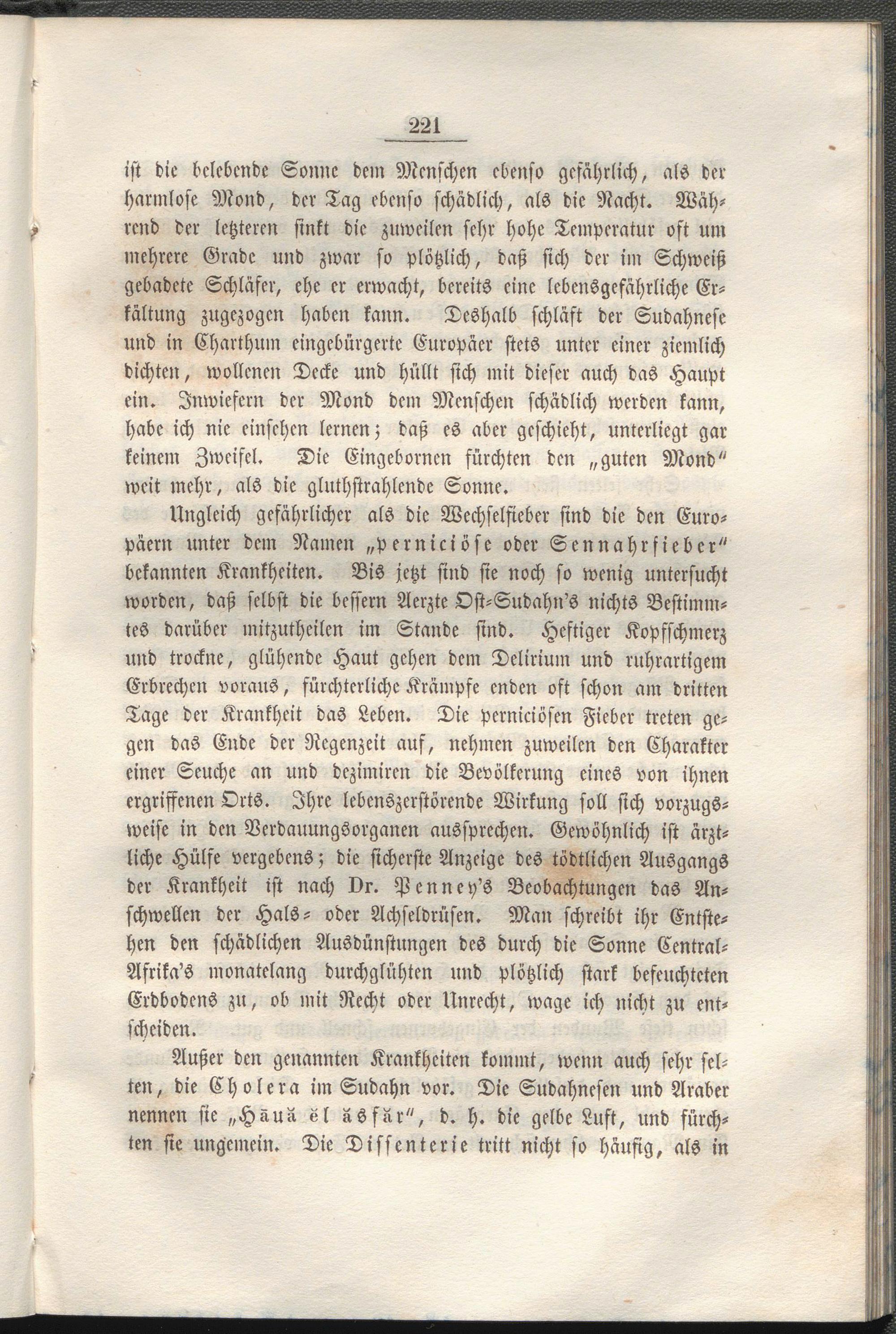 Außer den genannten Krankheiten kommt, wenn auch sehr selten, die Cholera im Sudahn vor. Die Sudahnesen und Araber nennen sie „Häuä «l äsfLr", d. h. die gelbe Luft, und fürchten sie ungcmein. Die Dissenterie tritt nicht so häufig, als in
