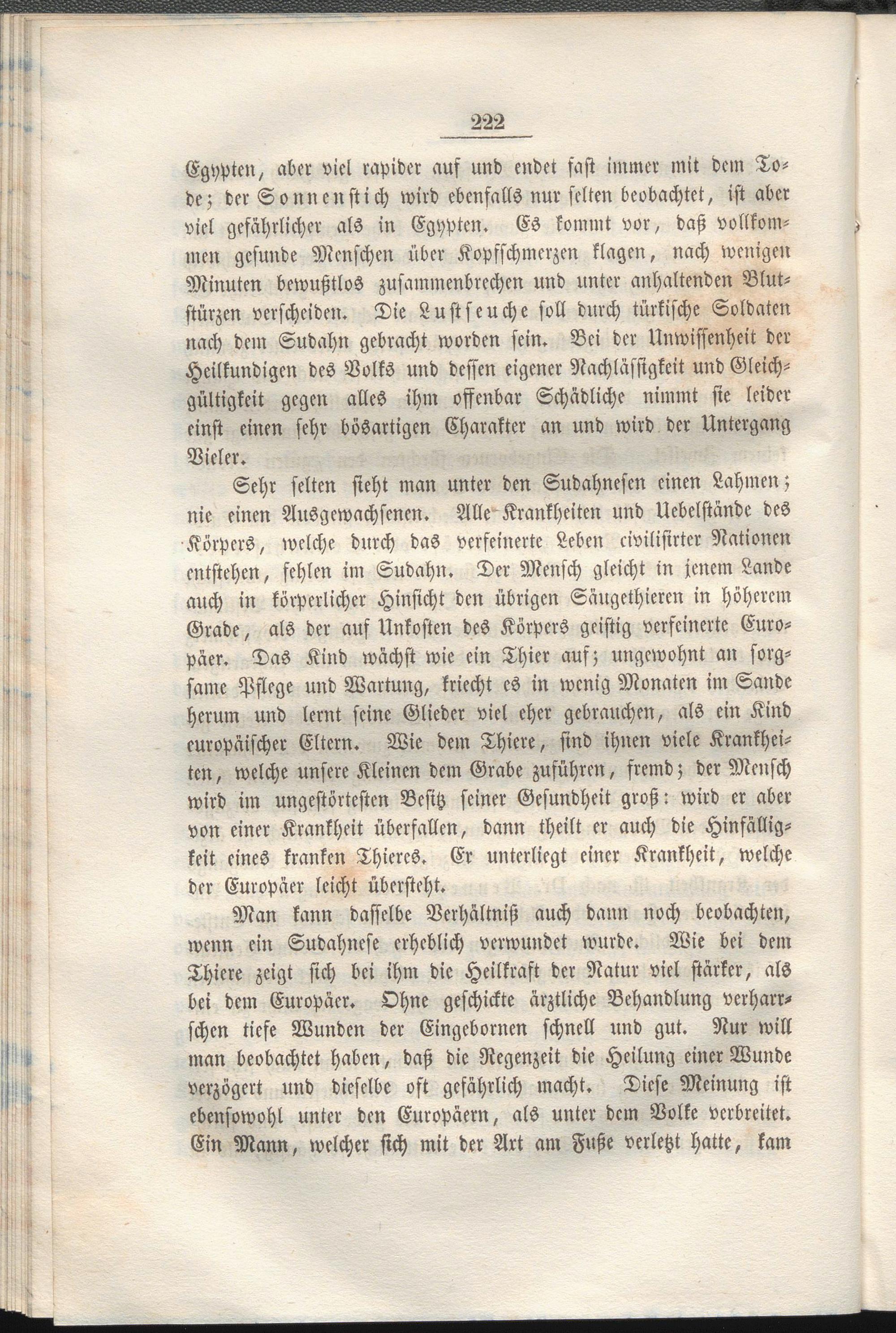 Egppten, aber viel rapider aus und endet fast immer mit dem Tode; der Sonnenstich wird ebenfalls nur selten beobachtet, ist aber viel gefährlicher als in Egppten. Es kommt vor, daß vollkommen gesunde Menschen über Kopfschmerzen klagen, nach wenigen Minuten bewußtlos zusammenbrechen und unter anhaltenden Blut- stürzen verscheiden. Die Lustseuche soll durch türkische Soldaten nach dem Sudahn gebracht worden sein. Bei der Unwissenheit der Heilkundigen des Volks und dessen eigener Nachlässigkeit und Gleichgültigkeit gegen alles ihm offenbar Schädliche nimmt sie leider einst einen sehr bösartigen Charakter an und wird der Untergang Vieler.