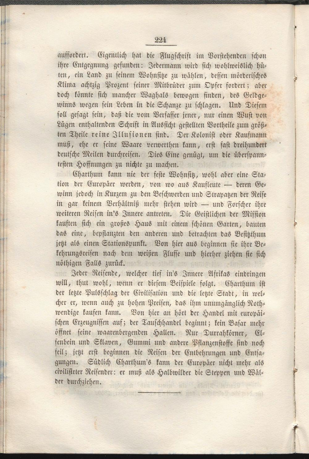Charthum kann nie der feste Wohnsitz, wohl aber eine Station der Europäer werden, von wo aus Kaufleute — deren Gewinn jedoch in Kurzem zu den Beschwerden und Strapatzen der Reise in gar keinem Verhältniß mehr stehen wird — und Forscher ihre weiteren Reisen in's Innere antreten. Die Geistlichen der Mission kauften sich ein großes Haus mit einem schönen Garten, bauten das eine, bepflanzten den anderen und betrachten das Besttzthum jetzt als einen Stationspunkt. Von hier aus beginnen sie ihre Bekehrungsreisen nach dem weißen Flusse und hierher ziehen sie sich nöthigen Falls zurück.