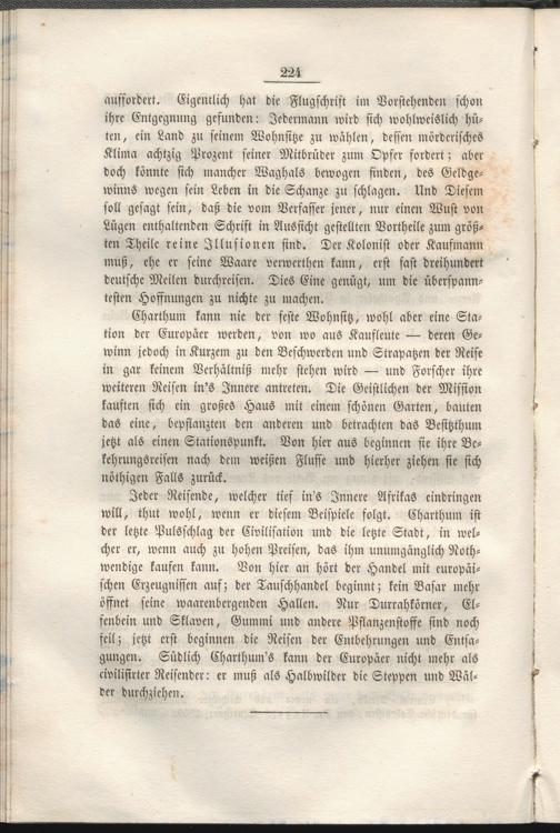 Jeder Reisende, welcher tief in's Innere Afrikas eindringen will, thut wohl, wenn er diesem Beispiele folgt. Charthum ist der letzte Pulsschlag der Civilisation und die letzte Stadt, in welcher er, wenn auch zu hohen Preisen, das ihm unumgänglich Nothwendige kaufen kann. Von hier an hört der Handel mit europäischen Erzeugnissen auf; der Tauschhandel beginnt; kein Basar mehr öffnet seine waarenbcrgenden Hallen. Nur Durrahkörner, Elfenbein und Sklaven, Gummi und andere Pflanzenstoffe sind noch feil; jetzt erst beginnen die Reisen der Entbehrungen und Entsagungen. Südlich Charthum's kann der Europäer nicht mehr als civilisirter Reisender: er muß als Halbwilder die Steppen und Wälder durchziehe».