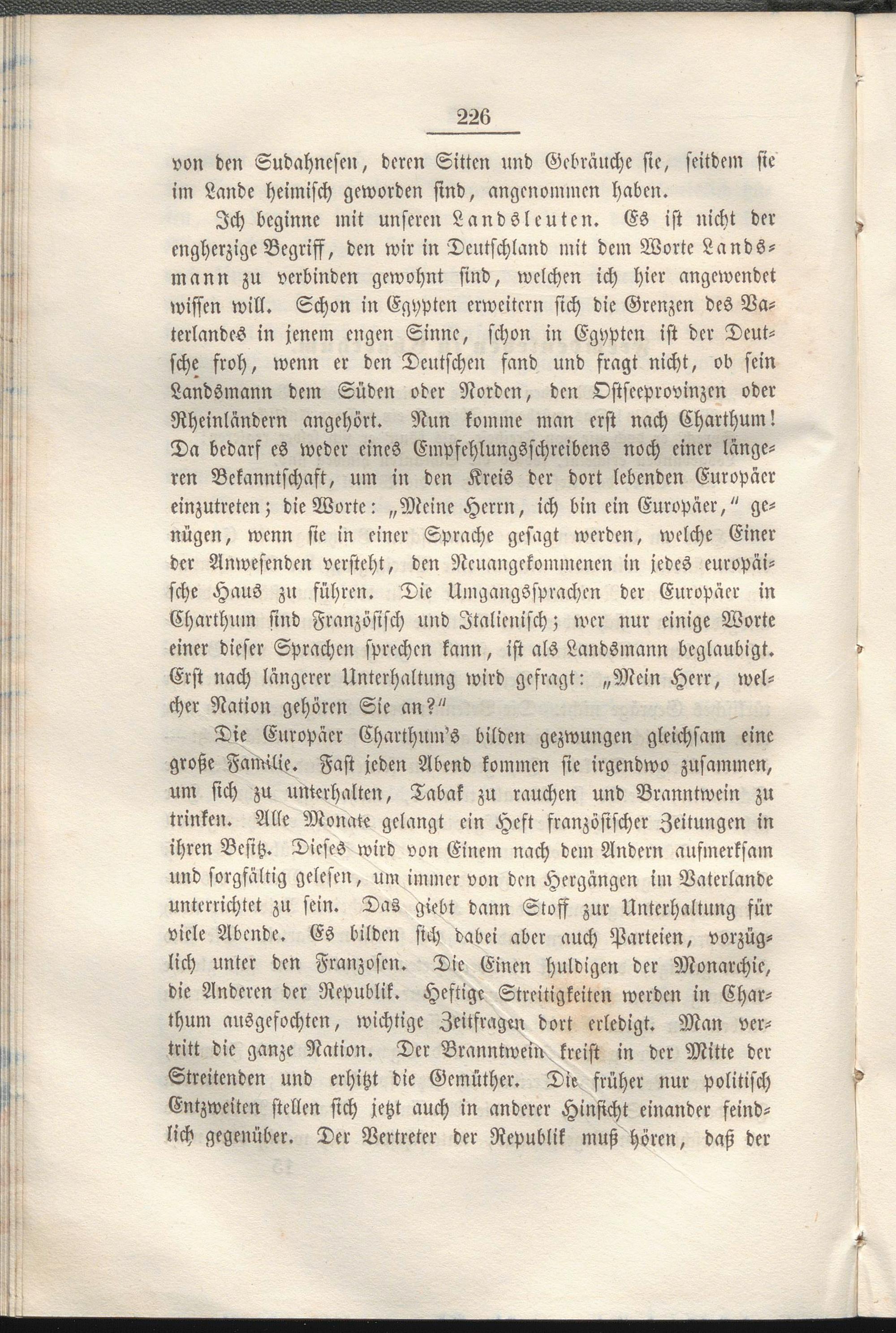 Die Europäer Charthum's bilden gezwungen gleichsam eine große Familie. Fast jeden Abend kommen sie irgendwo zusammen, um sich zu unterhalten, Tabak zu rauchen und Branntwein zu trinken. Alle Monat« gelangt ein Heft französischer Zeitungen in ihren Besitz. Dieses wird von Einem nach dem Andern aufmerksam und sorgfältig gelesen, um immer von den Hergängen im Vaterlande unterrichtet zu sein. Das giebt dann Stoff zur Unterhaltung für viele Abende. Es bilden sich dabei aber auch Parteien, vorzüglich unter den Franzosen. Die Einen huldigen der Monarchie, die Anderen der Republik. Heftige Streitigkeiten werden in Charthum ausgefochten, wichtige Zeitftagen dort erledigt. Man vertritt die ganze Nation. Der Branntwein^ kreist in der Mitte der Streitenden und erhitzt die Gemüther. Die früher nur politisch Entzweiten stellen sich jetzt auch in anderer Hinsicht einander feindlich gegenüber. Der Vertreter der Republik muß hören, daß der