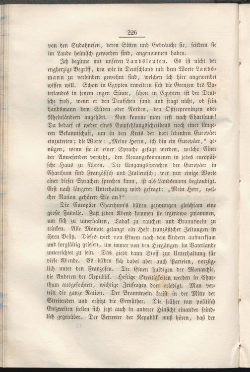 Ich beginne mit unseren Landsleutcn. Es ist nicht der engherzige Begriff, den wir in Deutschland mit dem Worte Landsmann zu verbinden gewohnt sind, welchen ich hier angewendet wissen will. Schon in Egyptcn erweitern sich die Grenzen des Vaterlandes in jenem engen Sinne, schon in Egyptcn ist der Deutsche froh, wenn er den Deutschen fand und fragt nicht, ob sein Landsmann dem Süden oder Norden, den Ostseeprovinzen oder Rheinländern angehört. Nun komme man erst nach Charthum! Da bedarf es weder eines Empfehlungsschreibens noch einer längeren Bekanntschaft, um in den Kreis der dort lebenden Europäer einzutreten; die Worte: „Meine Herrn, ich bin ein Europäer," genügen, wenn sie in einer Sprache gesagt werden, welche Einer der Anwesenden versteht, den Neuangekommenen in jedes europäische Haus zu führen. Die Umgangssprachen der Europäer in Charthum sind Französisch und Italienisch; wer nur einige Worte einer dieser Sprachen sprechen kann, ist als Landsmann beglaubigt. Erst nach längerer Unterhaltung wird gefragt: „Mein Herr, welcher Nation gehören Sie an?"