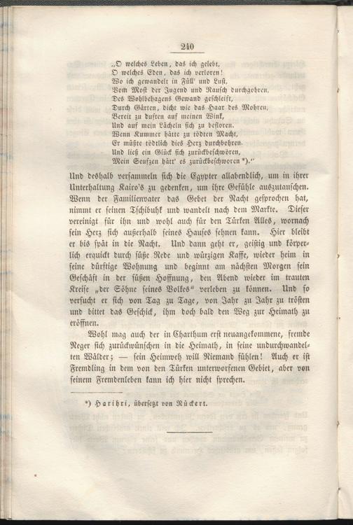 Wohl mag auch der in Charthum erst Neuangekommene, fremde Neger sich zurückwünschen in die Heimath, in seine undurchwandel- ten Wälder; — sein Heimweh will Niemand fühlen! Auch er ist Fremdling in dem von den Türken unterworfenen Gebiet, aber von seinem Fremdenlebcn kann ich hier nicht sprechen.