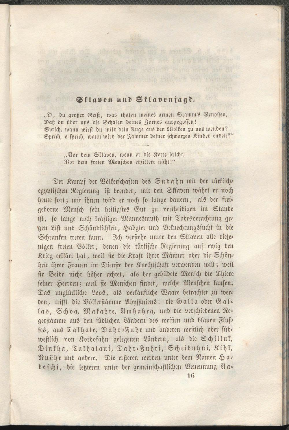 Der Kampf der Völkerschaften des Sud ahn mit der türkisch- cgyptischen Regierung ist beendet, mit den Sklaven währt er noch heute fort; mit ihnen wird er noch so lange dauern, als der frei- gcborne Mensch sein heiligstes Gut zu vertheidigen im Stande ist, so lange noch kräftiger ManncSmuth mit Todesverachtung gehen List und Schändlichkeit, Habgier und Bekncchtungssucht in die Schranken treten kann. Ich verstehe unter den Sklaven alle diejenigen freien Völker, denen die türkische Regierung auf ewig den Krieg erklärt hat, weil sie die Kraft ihrer Männer oder die Schönheit ihrer Frauen im Dienste der Knechtschaft verwenden will; weil sie Beide nicht höher achtet, als der gebildete Mensch die Thiere seiner Heerden; weil sie Menschen findet, welche Menschen kaufen. Das unglückliche Loos, als verkäufliche Waare betrachtet zu werden, trifft die Völkcrstämme Abyssinicns: die Galla oder Gal- las, Schon, Makahte, Amhahra, und die verschiedenen Ne- gerstämmc aus den südlichen Ländern des weißen und blauen Flusses, aus Takhale, Dahr-Fuhr und anderen westlich oder südwestlich von Kordofahn gelegenen Ländern, als die Schilluk, Dinkha, Takhalaui, Dahr-Fuhri, Scheibuhni, Kihk, Nuöhr und andere. Die ersteren werden unter dem Namen Herbe schi, die letzteren unter der gemeinschaftlichen Benennung Aa-