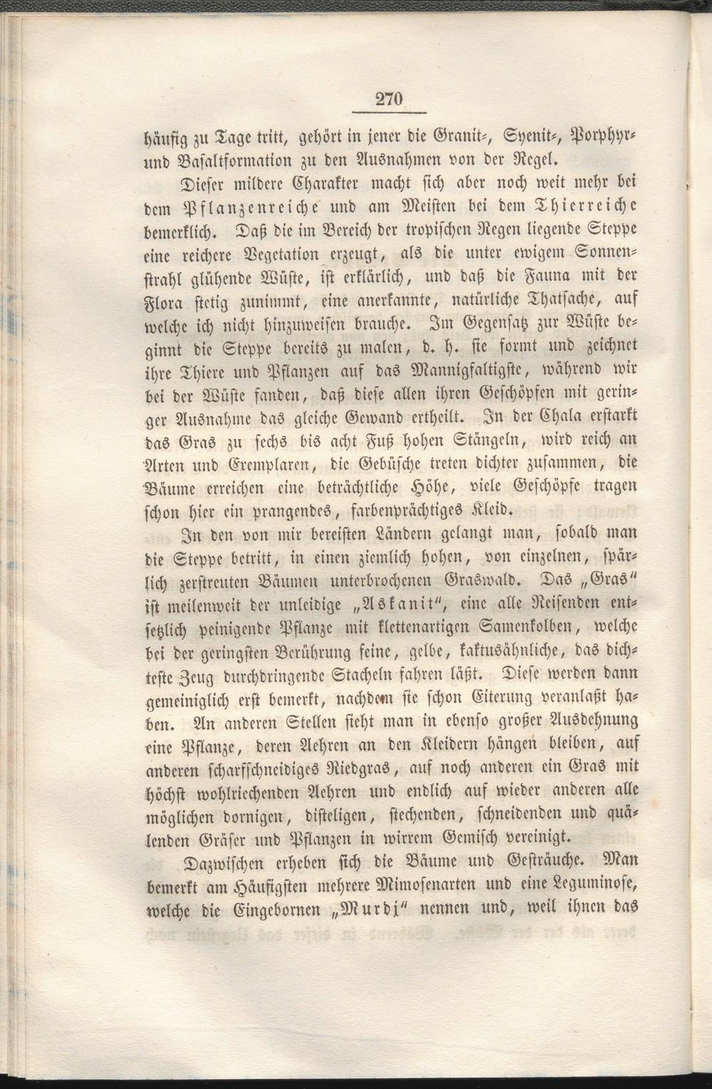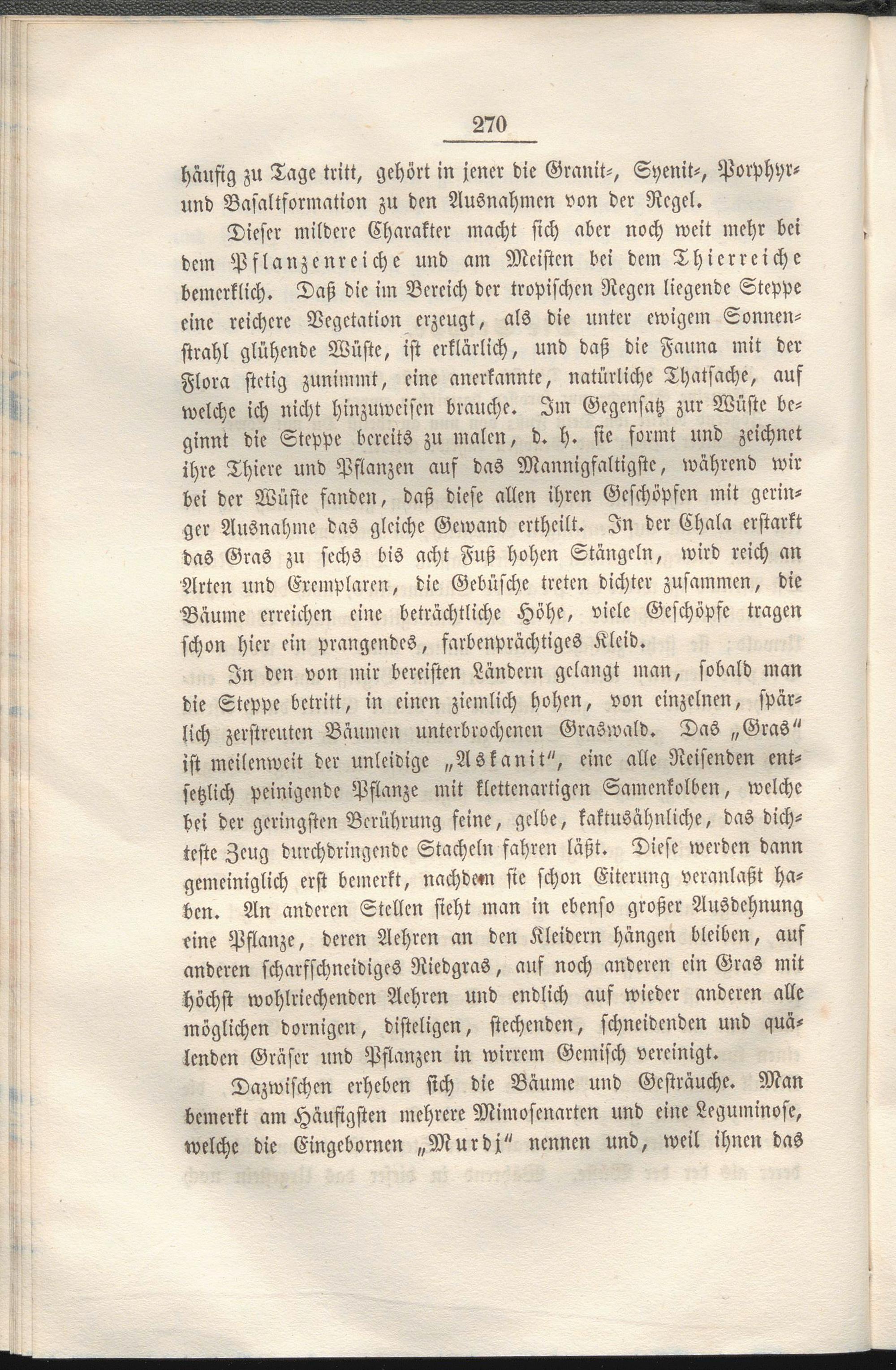 Dieser mildere Charakter macht sich aber noch weit mehr bei dem Pflanzenreiche und am Meisten bei dem Thierreichc bemcrklich. Daß die im Bereich der tropischen Regen liegende Steppe eine reichere Vegetation erzeugt, als die unter ewigem Sonnenstrahl glühende Wüste, ist erklärlich, und daß die Fauna mit der Flora stetig zunimmt, eine anerkannte, natürliche Thatsache, auf welche ich nicht hinzuweisen brauche. Im Gegensatz zur Wüste beginnt die Steppe bereits zu malen, d. h. sie formt und zeichnet ihre Thiere und Pflanzen auf das Mannigfaltigste, wahrend wir bei der Wüste fanden, daß diese allen ihren Geschöpfen mit geringer Ausnahme das gleiche Gewand ertheilt. In der Chala erstarkt das Gras zu sechs bis acht Fuß hohen Stängcln, wird reich an Arten und Eremplaren, die Gebüsche treten dichter zusammen, die Bäume erreichen eine beträchtliche Höhe, viele Geschöpfe tragen schon hier ein prangendes, farbenprächtiges Kleid.