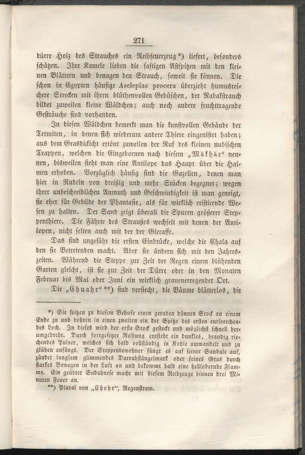In diesen Wäldchen bemerkt man die kunstvollen Gebäude der Termiten, in denen sich wiederum andere Thiere eingenistet haben; aus dem Grasdickicht ertönt zuweilen der Ruf des kleinen nubischcn Trappen, welchen die Eingebornen nach diesem „MLkhLr" nennen, bisweilen sieht man eine Antilope das Haupt über die Halmen erhoben. Vorzüglich häufig sind die Gazellen, denen man hier in Rudeln von dreißig und mehr Stücken begegnet; wegen ihrer unbeschreiblichen Anmuth und Geschwindigkeit ist man geneigt, sie eher für Gebilde der Phantasie, als für wirklich cristirende Wesen zu halten. Der Sand zeigt überall die Spuren größerer Step- penthicre. Die Fährte des Straußes wechselt mit denen der Antilopen, nicht selten auch mit der der Gieraffe.