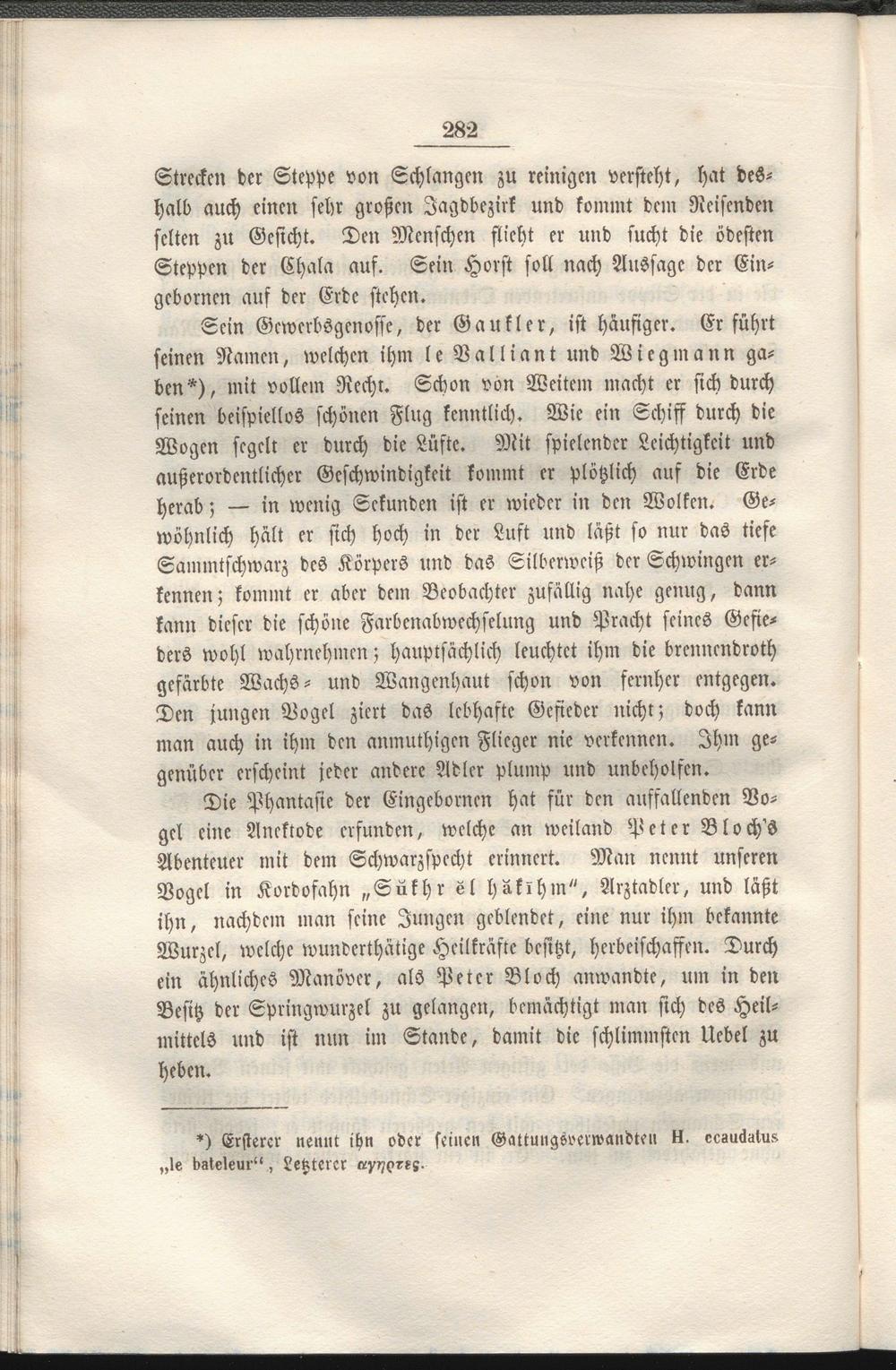 Strecken der Steppe von Schlangen zu reinigen versteht, hat deshalb auch einen sehr großen Jagdbezirk und kommt dem Reisenden selten zu Gesicht. Den Menschen flicht er und sucht die ödesten Steppen der Chala auf. Sein Horst soll nach Aussage der Ein- gcborncn auf der Erde stehen.