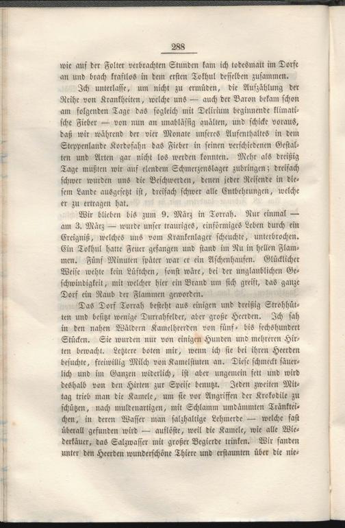 Ich unterlasse, um nicht zu ermüden, die Auszählung der Reihe von Krankheiten, welche uns — auch der Baron bekam schon am folgenden Tage das sogleich mit Delirium beginnende klimatische Fieber — von nun an unablässig quälten, und schicke voraus, daß wir während der vier Monate unseres Aufenthaltes in dem Steppenlande Kordofahn das Fieber in seinen verschiedenen Gestalten und Arten gar nicht los werden konnten. Mehr als dreißig Tage mußten wir auf elendem Schmcrzcnslager zubringen; dreifach schwer wurden uns die Beschwerden, denen jeder Reisende in diesem Lande ausgesetzt ist, dreifach schwer alle Entbehrungen, welche er zu ertragen hat.