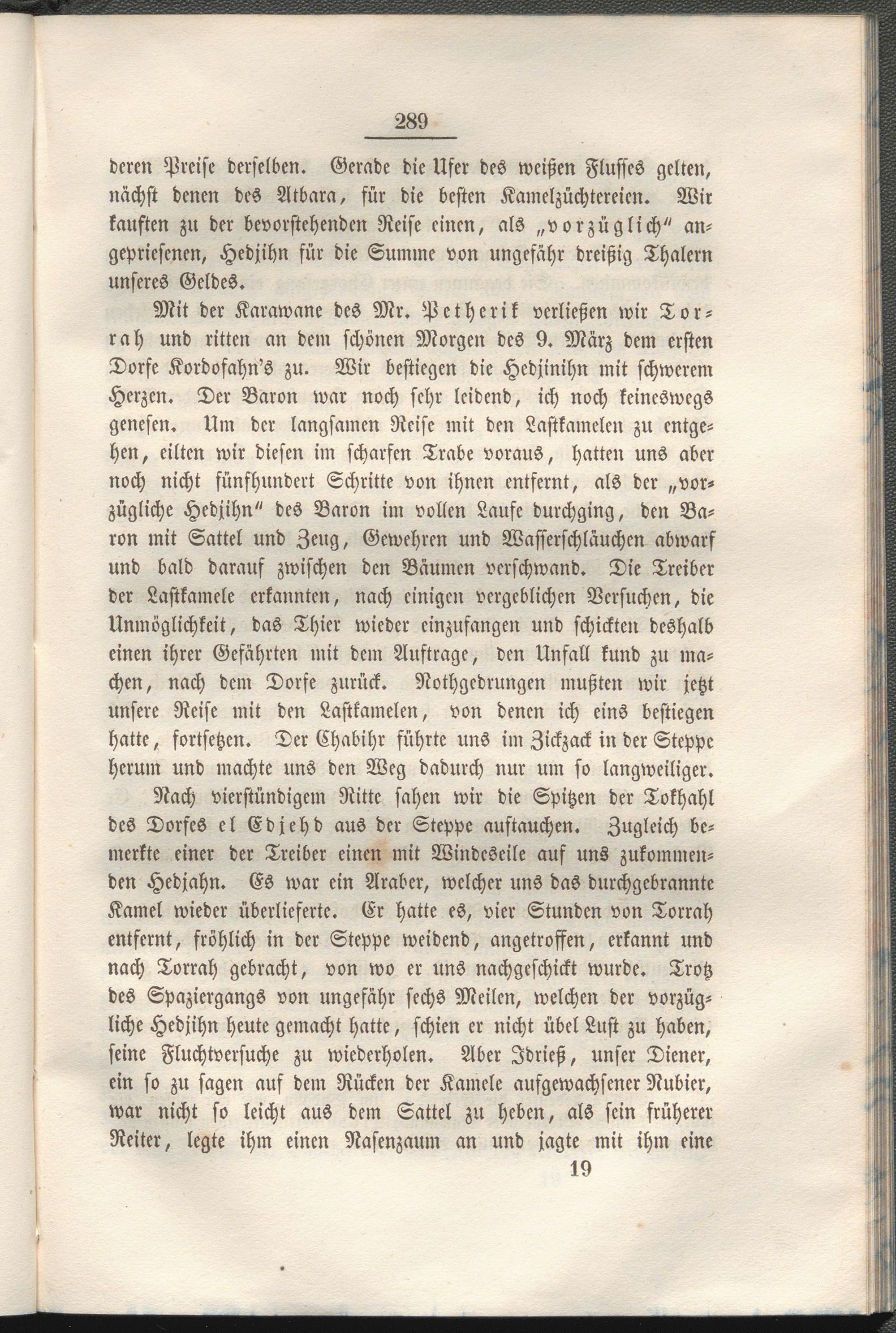 Mit der Karawane des Mr. Pethcrik verließen wir Torrah und ritten an dem schönen Morgen des 9. März dem ersten Dorfe Kordofahn's zu. Wir bestiegen die Hedjinihn mit schwerem Herzen. Der Baron war noch sehr leidend, ich noch keineswegs genesen. Um der langsamen Reise mit den Lastkamelen zu entgehen, eilten wir diesen im scharfen Trabe voraus, hatten uns aber noch nicht fünfhundert Schritte von ihnen entfernt, als der „vorzügliche Hedjihn" des Baron im vollen Laufe durchging, den Baron mit Sattel und Zeug, Gewehren und Wasserschläuchen abwarf und bald darauf zwischen den Bäumen verschwand. Die Treiber der Lastkamele erkannten, nach einigen vergeblichen Versuchen, die Unmöglichkeit, das Thier wieder einzufangen und schickten deshalb einen ihrer Gefährten mit dem Auftrage, den Unfall kund zu machen, nach dem Dorfe zurück. Nothgedrungen mußten wir jetzt unsere Reise mit den Lastkamelen, von denen ich eins bestiegen hatte, fortsetzen. Der Chabihr führte uns im Zickzack in der Steppe herum und machte uns den Weg dadurch nur um so langweiliger.