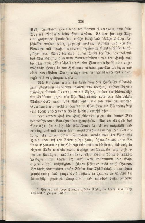 Wir Europäer waren für heute von dem Hochzeiter feierlichst zum Abendessen eingeladen worden und brachen, unseren liebenswürdigen Freund Penney an der Spitze, in den verschiedenartigsten Kostümen gegen vier Uhr Nachmittags nach dem Lchmpalaste Muhsa-Be'i's auf. Als Anhängsel hatte sich uns ein Grieche, Constantini, welcher damals in Charthum als Blatterimpfarzt eine höchst unbedeutende Rolle spielte, angeschlossen.