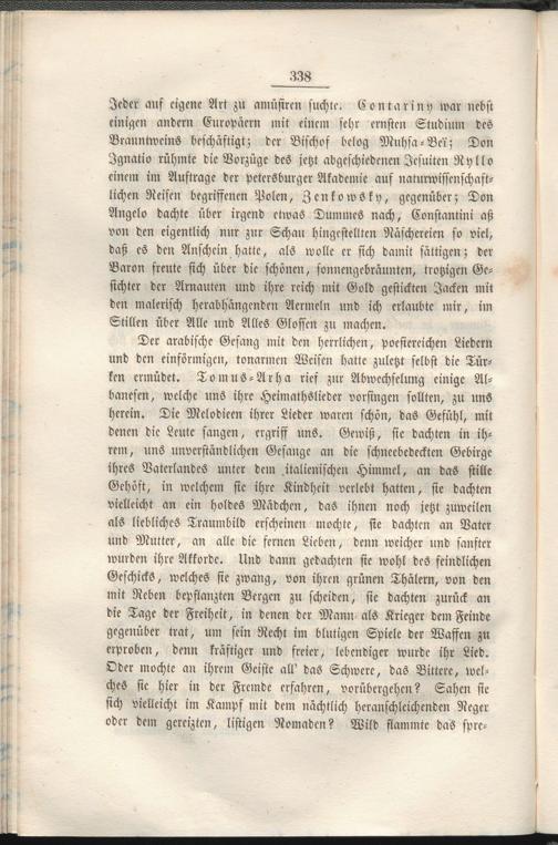 Jeder auf eigene Art zu amüsiren suchte. Eontarin y war uebft einigen andern Europäern mit einem sehr ernsten Studium des Branntweins beschäftigt; der Bischof belog Muhsa-Bei; Don Jgnatio rühmte die Vorzüge des jetzt abgeschiedenen Jesuiten Ryllo einem im Auftrage der Petersburger Akademie auf naturwissenschaftlichen Reisen begriffenen Polen, Zcnkowsky, gegenüber; Don Angclo dachte über irgend etwas Dummes nach, Constantini aß von den eigentlich nur zur Schau hingestellten Näschereien so viel, daß es den Anschein hatte, als wolle er sich damit sättigen; der Baron freute sich über die schönen, sonnengebräunten, trotzigen Gesichter der Arnauten und ihre reich mit Gold gestickten Jacken mit den malerisch herabhängenden Acrmeln und ich erlaubte mir, im Stillen über Alle und Alles Glossen zu machen.