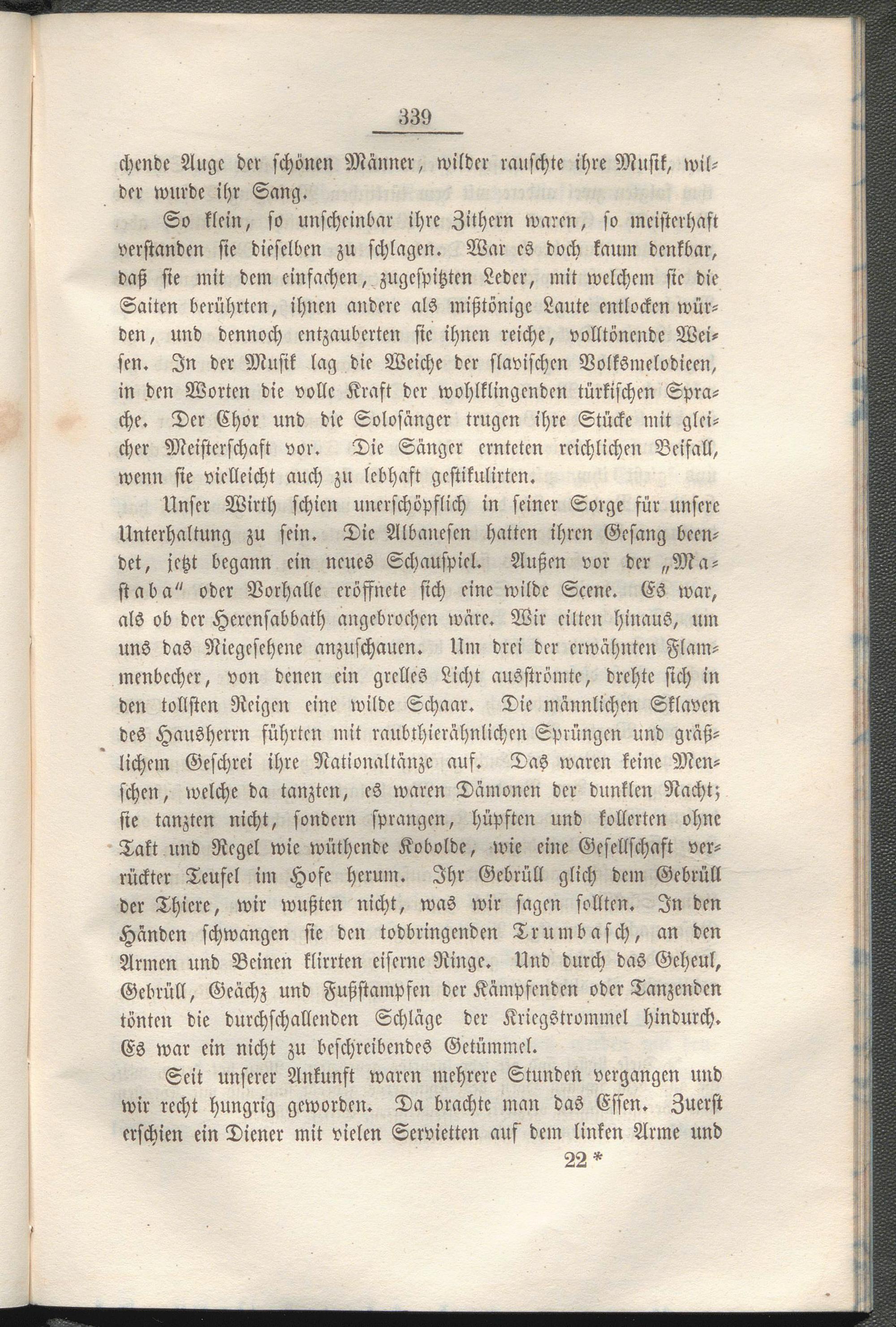Unser Wirth schien unerschöpflich in seiner Sorge für unsere Unterhaltung zu sein. Die Albanescn hatten ihren Gesang beendet, jetzt begann ein neues Schauspiel. Außen vor der „Mast ab a" oder Vorhalle eröffnete sich eine wilde Scene. Es war, als ob der Hercnsabbath angebrochen wäre. Wir eilten hinaus, um uns das Niegesehcnc anzuschauen. Um drei der erwähnten Flam- menbcchcr, von denen ein grelles Licht ausströmte, drehte sich in den tollsten Reigen eine wilde Schaar. Die männlichen Sklaven des Hausherrn führten mit raubthierähnlichen Sprüngen und gräßlichem Geschrei ihre Nationaltänzc auf. Das waren keine Menschen, welche da tanzten, es waren Dämonen der dunklen Nacht; sie tanzten nicht, sondern sprangen, hüpften und kollerten ohne Takt und Regel wie wüthende Kobolde, wie eine Gesellschaft verrückter Teufel im Hofe herum. Ihr Gebrüll glich dem Gebrüll der Thiere, wir wußten nicht, was wir sagen sollten. In den Händen schwangen sie den todbringenden Trumbasch, an den Armen und Beinen klirrten eiserne Ringe. Und durch das Geheul, Gebrüll, Geächz und Fußstampfen der Kämpfenden oder Tanzenden tönten die durchschallenden Schläge der Kricgstrommel hindurch. Es war ein nicht zu beschreibendes Getümmel.