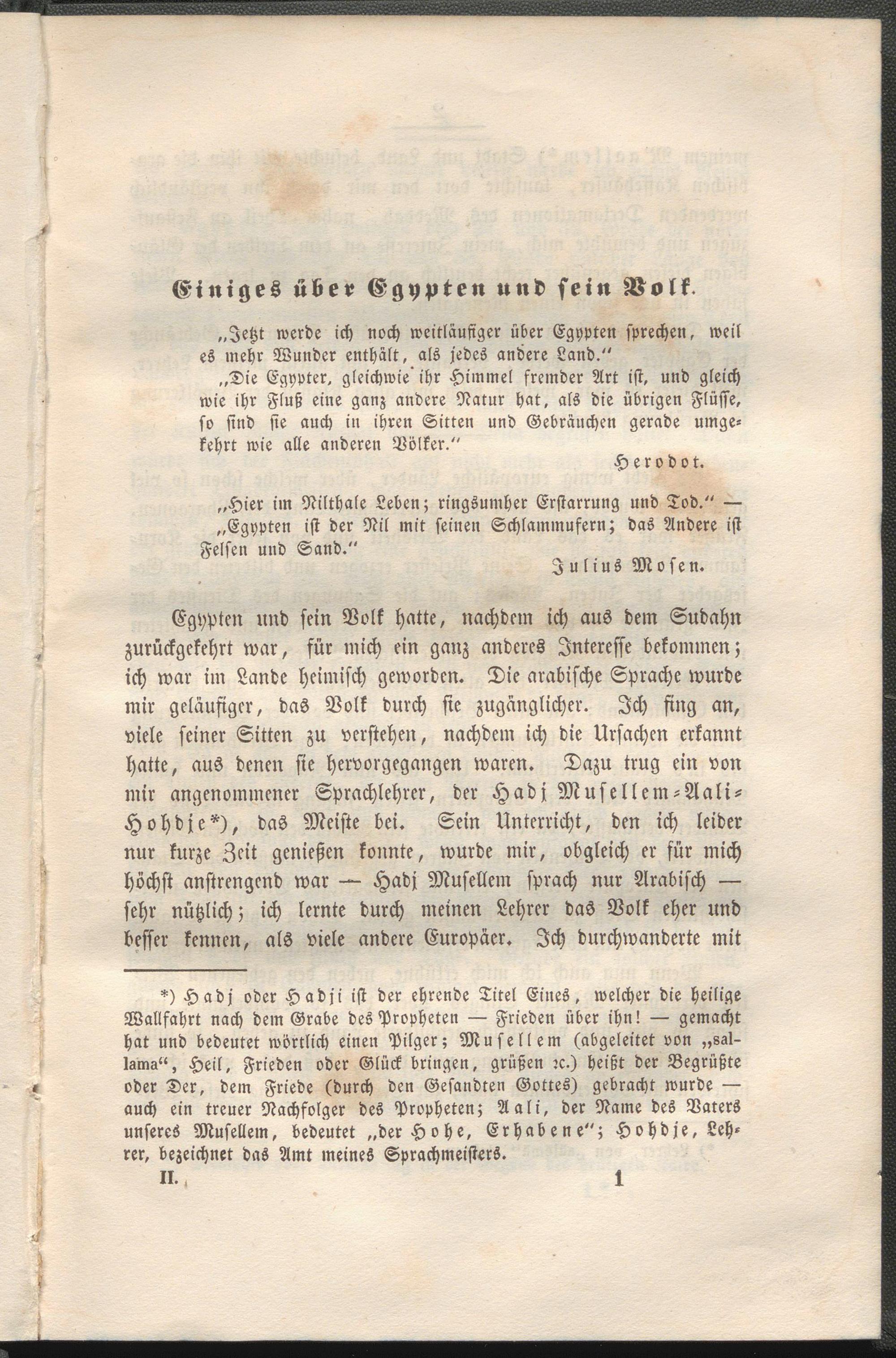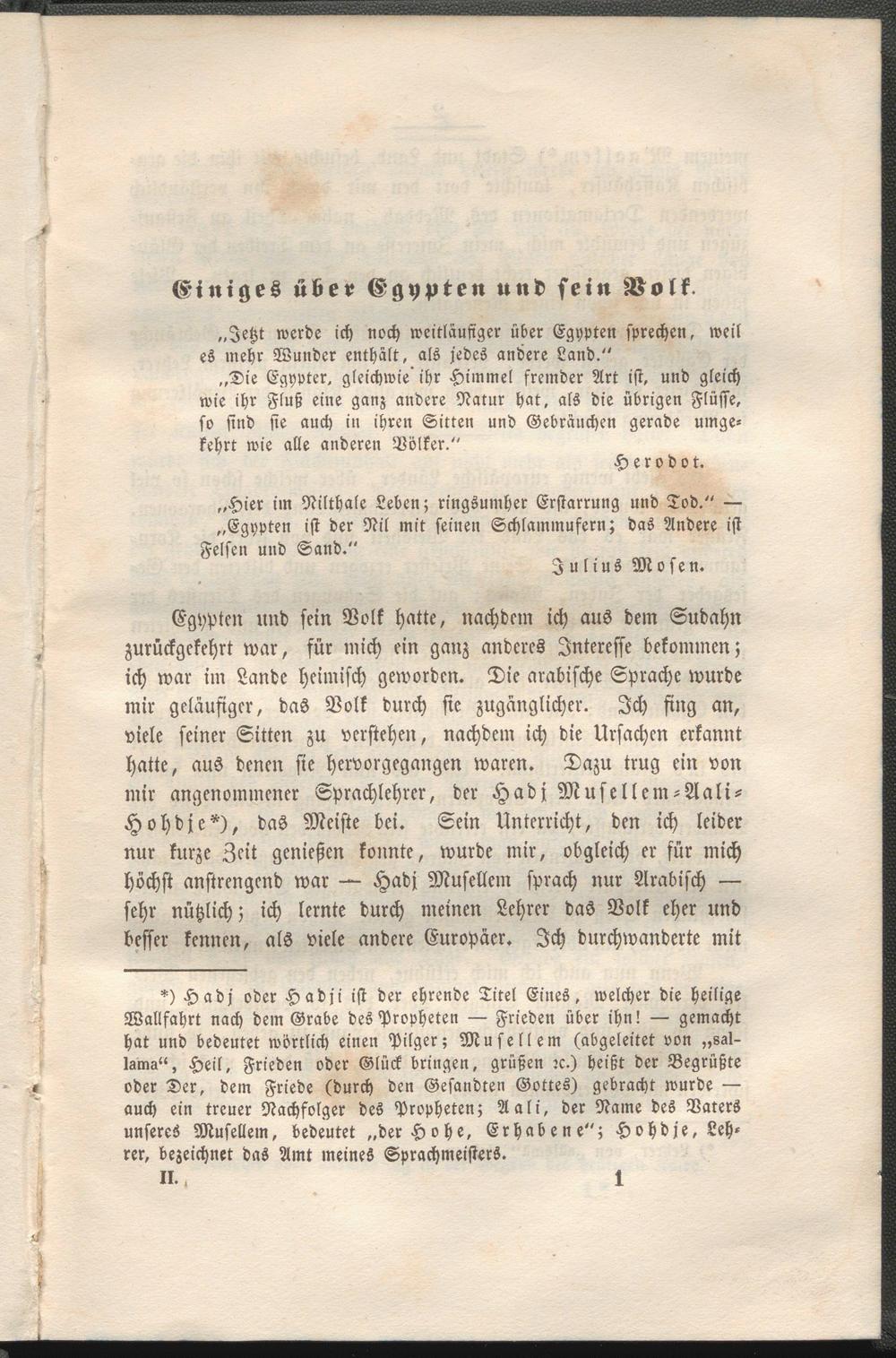 Egypten und sein Volk hatte, nachdem ich aus dem Sudahn zurückgekehrt war, für mich ein ganz anderes Interesse bekommen; ich war im Lande heimisch geworden. Die arabische Sprache wurde mir geläufiger, das Volk durch sie zugänglicher. Ich fing an, viele seiner Sitten zu verstehen, nachdem ich die Ursachen erkannt hatte, aus denen sie hervorgegangen waren. Dazu trug ein von mir angenommener Sprachlehrer, der Hadj Musellem-Aali- Hohdje*), daS Meiste bei. Sein Unterricht, den ich leider nur kurze Zeit genießen konnte, wurde mir, obgleich er für mich höchst anstrengend war — Hadj Musellem sprach nur Arabisch — sehr nützlich; ich lernte durch meinen Lehrer das Volk eher und besser kennen, als viele andere Europäer. Ich durchwanderte mit