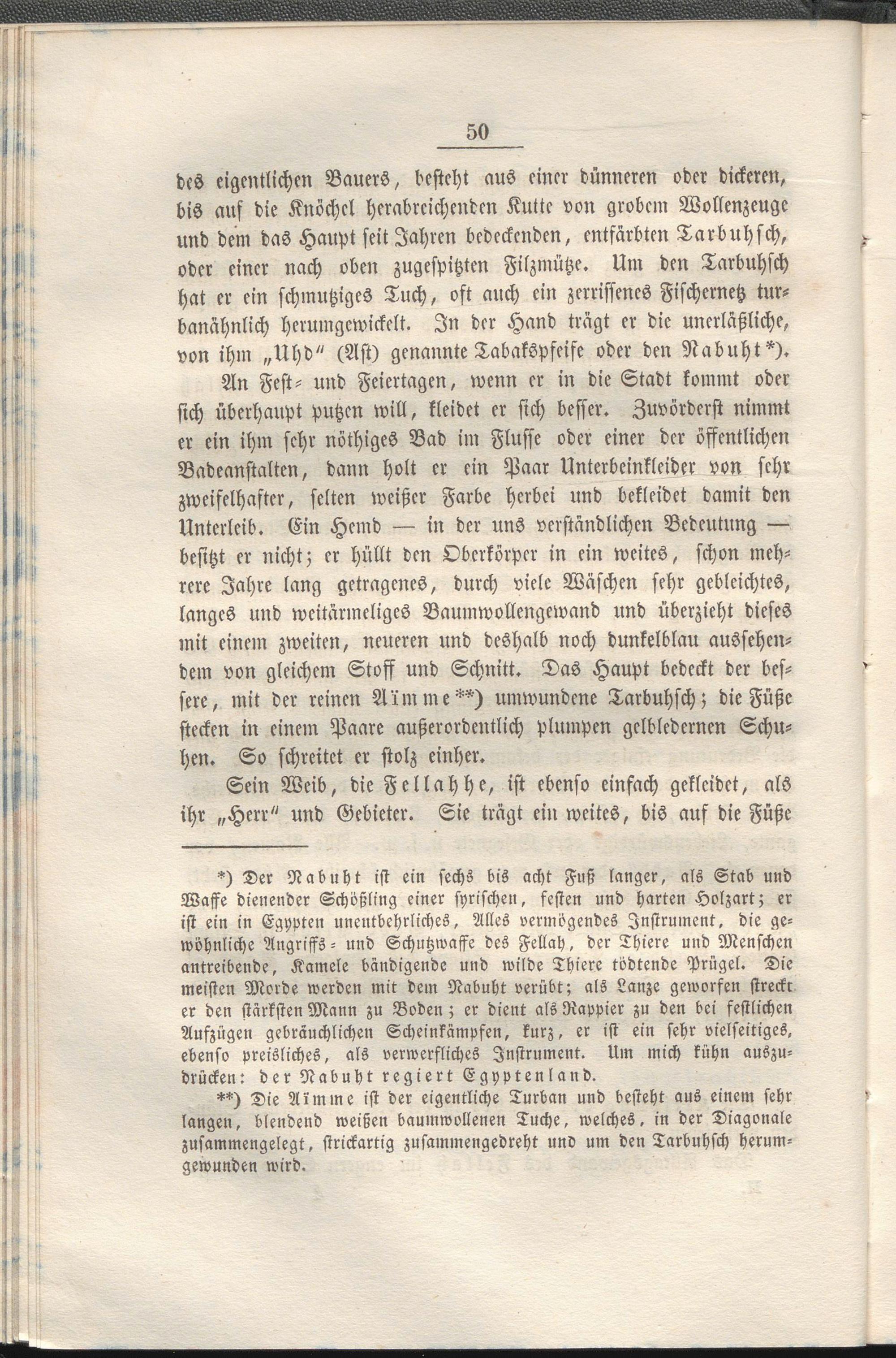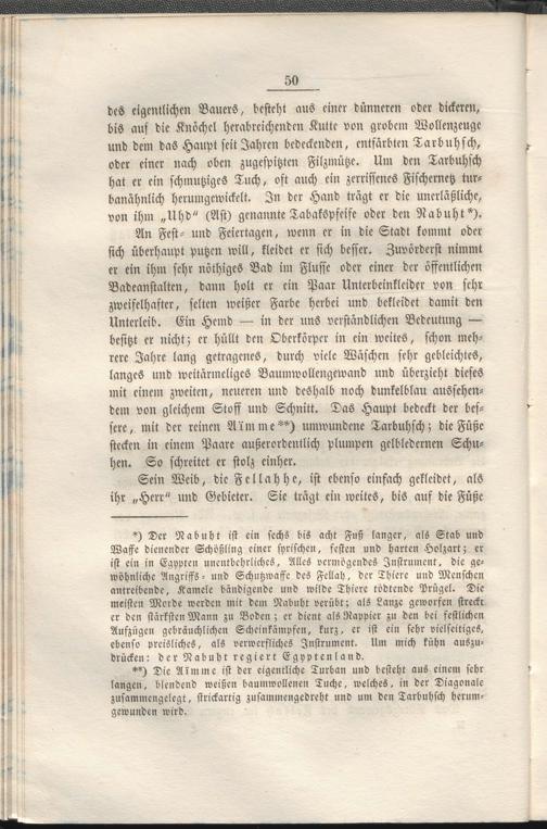 *) Der Nabuht ist ein sechs bis acht Fuß langer, als Stab und Waffe dienender Schößling einer syrischen, festen und harten Holzart; er ist ein in Egppten unentbehrliches. Alles vermögendes Instrument, die gewöhnliche Angriffs - und Schutzwaffe des Fellah, der Thiere und Menschen antreibende, Kamele bändigende und wilde Thiere tödtende Prügel. Die meisten Morde werden mit dem Nabuht verübt; als Lanze geworfen streckt er den stärksten Mann zu Boden; er dient als Rappier zu den bei festlichen Auszügen gebräuchlichen Scheinkämpfen, kurz, er ist ein sehr vielseitiges, ebenso preisliches, als verwerfliches Instrument. Um mich kühn auszudrücken: der Nabuht regiert Egyptenland.