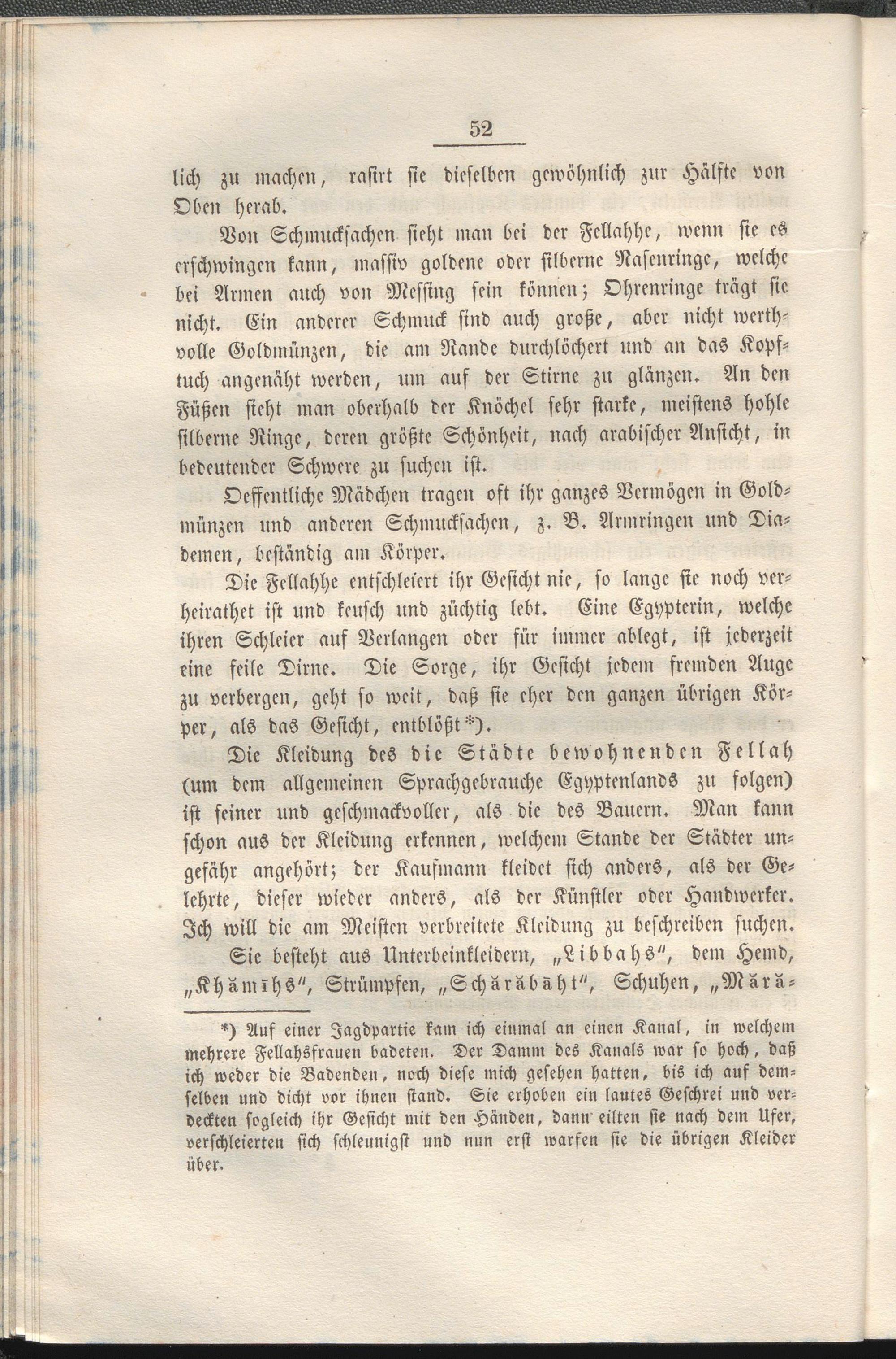 *) Auf einer Jagdpartie kam ich einmal an einen Kanal, in welchem Mehrere Fellahsfrauen badeten. Der Damm des Kanals war so hoch, daß ich weder die Badenden, noch diese mich gesehen hatten, bis ich auf demselben und dicht vor ibnen stand. Sie erhoben ein lautes Geschrei und verdeckten sogleich ihr Gesicht mit den Händen, dann eilten sie nach dem Ufer, verschleierten sich schleunigst und nun erst warfen sie die übrigen Kleider über.