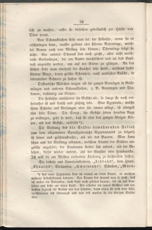Die Kleidung des die Städte bewohnenden Fellah (um dem allgemeinen Sprachgebrauch Egyptenlands zu folgen) ist seiner und geschmackvoller, als die des Bauern. Man kann schon aus der Kleidung erkennen, welchem Stande der Städter ungefähr angehört; der Kaufmann kleidet sich anders, als der Gelehrte, dieser wieder anders, als der Künstler oder Handwerker. Ich will die am Meisten verbreitete Kleidung zu beschreiben suchen.