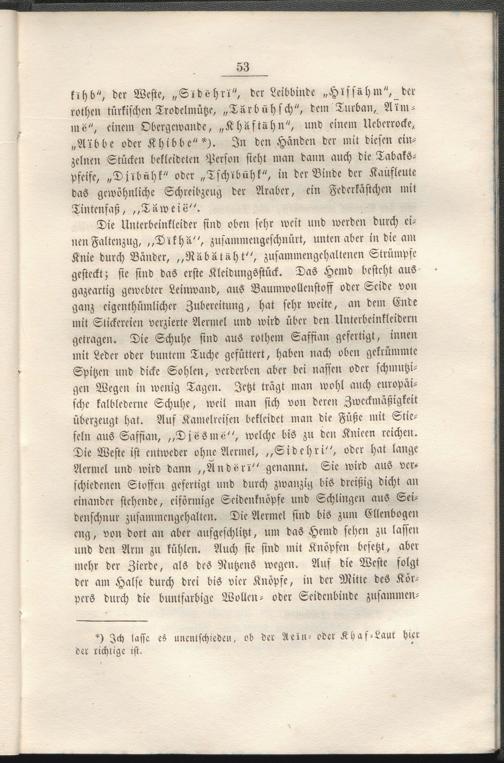 kihb", der Weste, „Sldöhrl", der Leibbinde „Hlssühm", der rothen türkischen Trodelmütze, „ T »rb »ihsch", dem Turban, A t >n - >uö", einem Obcrgewande, „KhLftühn", und einem Ueberrocke, „A'rbbe oder Khibbe"*). In den Händen der mit diesen einzelnen Stücken bekleideten Person sieht man dann auch die Tabakspfeife, „Djibähk" oder „Tscht'bühk", in der Binde der Kaufleute das gewöhnliche Schreibzeug der Araber, ein Federkästchen mit Tintenfaß, „Trlweiö".