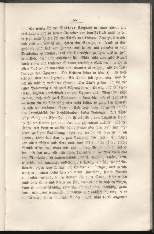 So wenig sich der Städter Egyptens in seinen Sitten und Gebräuchen und in seinem Charakter von dem Fellah unterscheidet, so sehr unterscheidet sich der Türke von Beiden. Jene gehören einer und derselben Nation an, haben eine Sprache, ein Land zu ihrer Hkimath und sind von Jugend auf so oft mit einander in enge Berührung gekommen, daß ein Unterschied zwischen Beiden zwar bemcrklich, aber nicht auffallend ist. Nicht leicht aber gibt es zwei durch einen und denselben Glauben vereinigte Nationen, welche in allein Anderen so unendlich von einander abweichen, als die Türken von den Egyptcrn. Die Ersteren stehen in jeder Hinsicht hoch erhaben über den Letzteren. Sie hassen sich gegenseitig, weil sie sich nie wirklich verbinden können. Der Türke zeichnet sich bei der ersten Begegnung durch zwei Eigenschaften, Stolz und Ehrgefühl, sogleich Vortheilhaft vor dem Egypter aus. Man sollte nicht meinen, daß diese zwei Tugenden — denn hier sind es Tugenden — wenn ein Volk sie besitzt oder nicht besitzt, so ganz den Charakter desselben verändern können. Und doch suche ich gerade in ihnen hauptsächlich die Verschiedenheit beider Nationen. Der Türke besitzt Stolz und Ehrgefühl und ist deshalb großer Tugenden fähig, welche der Araber gar nicht oder nur gezwungen ausübt. Ob der Erstere dem Letzteren an Gcistcsfähigkeitcn überlegen oder einer größeren geistigen Ausbildung fähig ist, möchte ich bezweifeln; ich glaube, dieser hat eben so gute Anlagen, wie jener. Ein Türke von altem Schrot und Korn muß uns als ein sehr edler, braver Mensch erscheinen, wenn nur uns in seine Verhältnisse hincindcn- ken. Er hat noch alle ritterlichen Tugenden unserer Vorfahren aus dem Mittelalter, ist patriarchalisch gastfrei, muthig, tapfer, treu, religiös, fast fanatisch, mildthätig, freigebig, ehrlich, wahrheitsliebend, gegen seine Diener und Sklaven ein strenger, aber gerechter Herr, seinem Beherrscher ein treuer Unterthan, seinem Freunde ein wahrer Freund, seinen Kindern ein guter Vater. Aber er hat auch viele Laster und Fehler an sich, wenigstens in unseren Augen, denn er ist herrschsüchtig, ehrgeizig, oft raublustig, wollüstig, grausam, manchmal tyrannisch, anmaßend und rachsüchtig, kurz, er ist ein Mensch, dessen natürliche Anlagen noch nicht durch allgemein